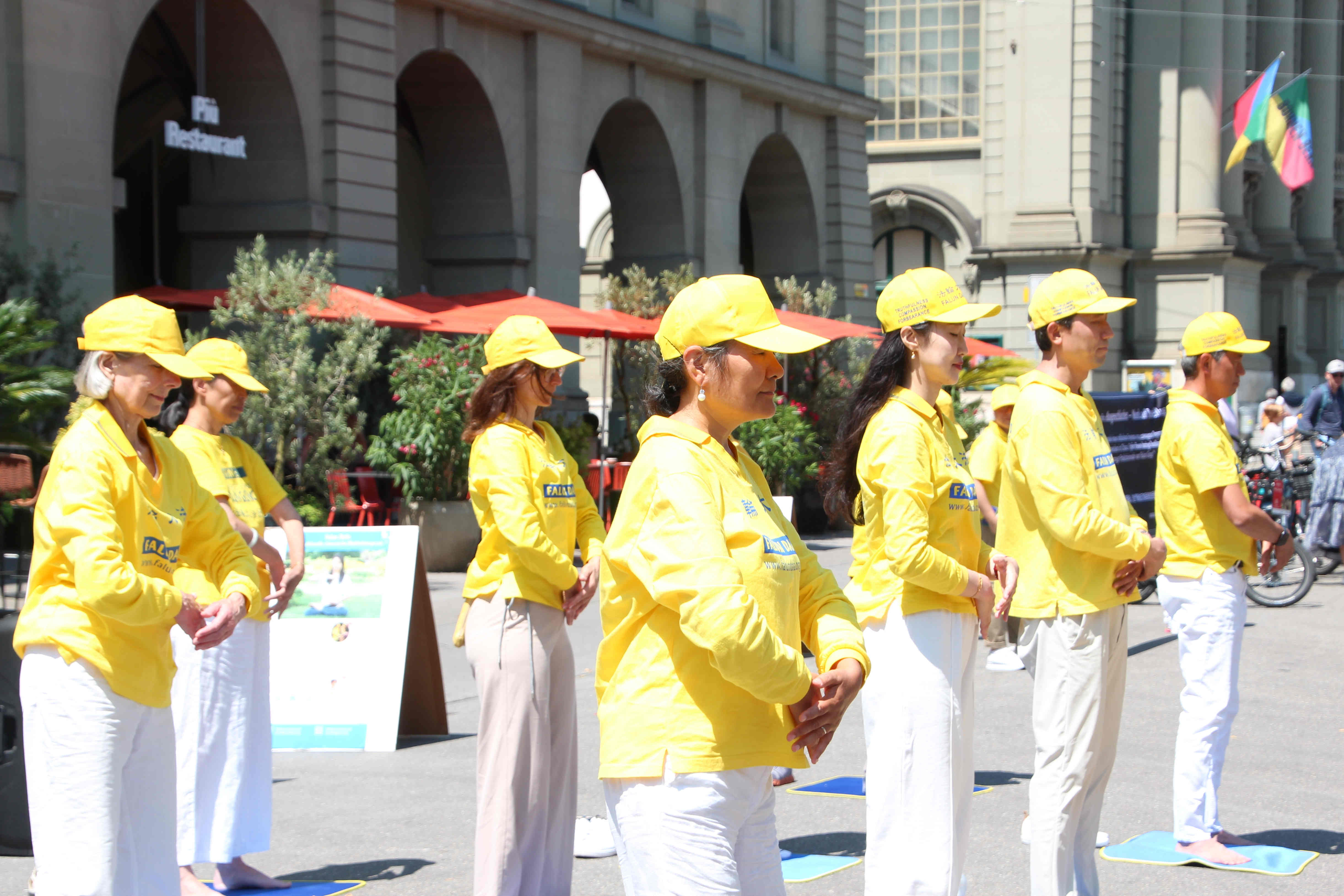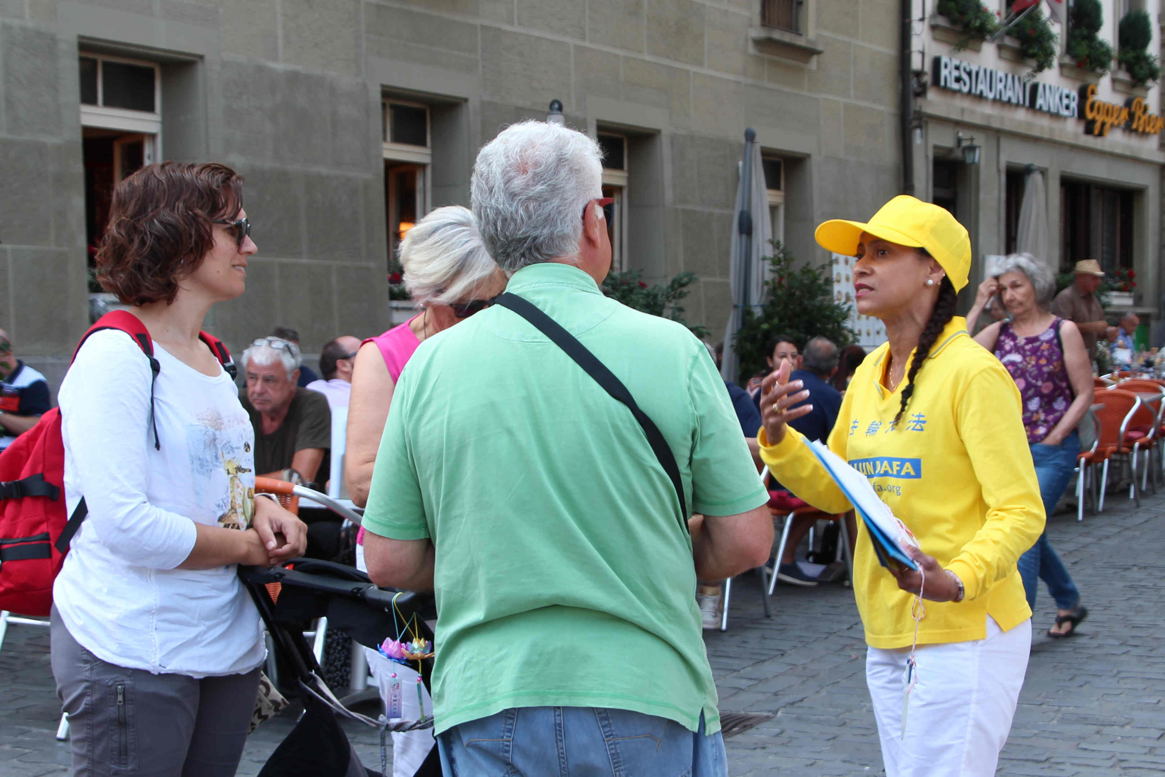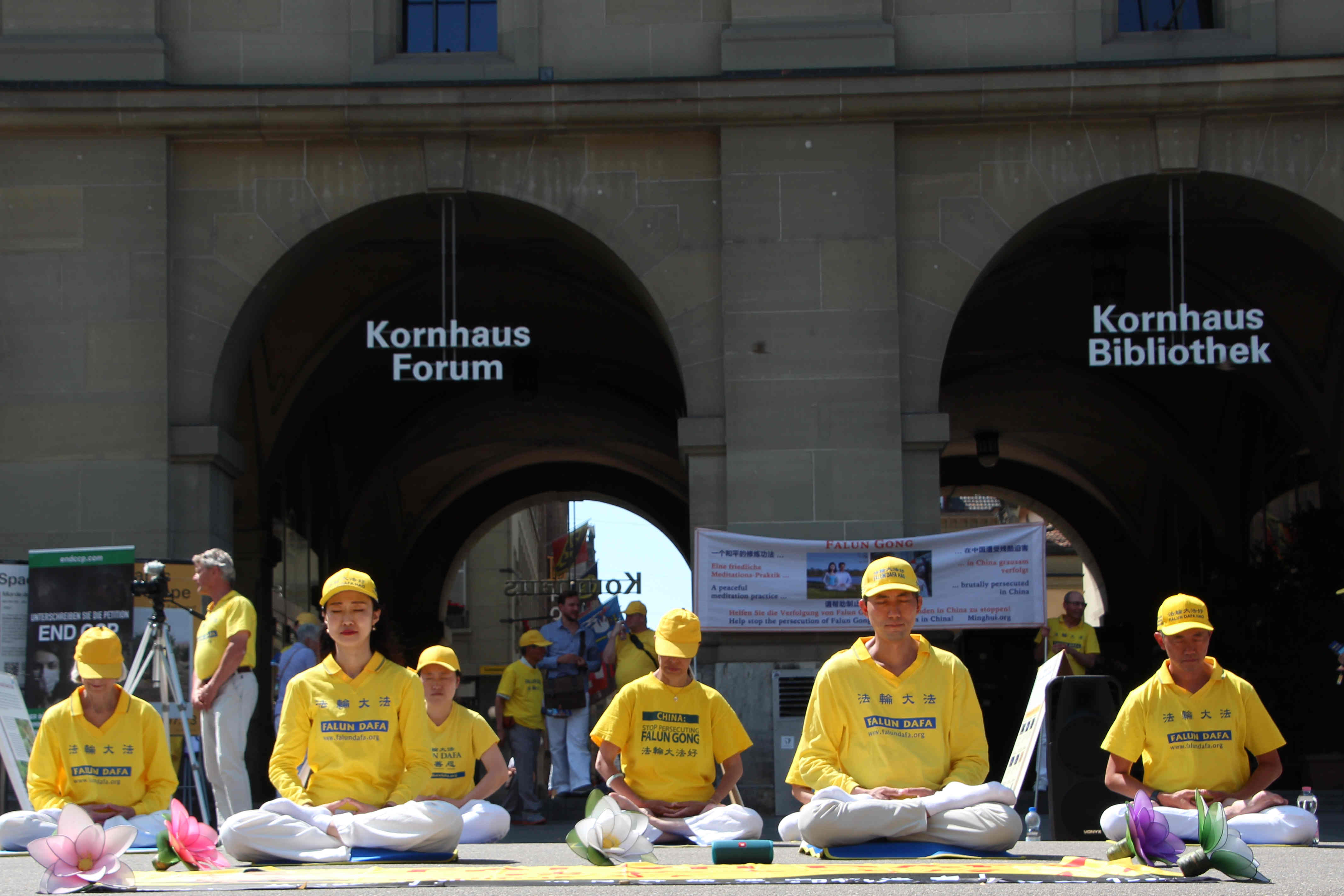 下午在伯尔尼市中心的控豪斯(Kornhaus)广场集会上,学员们再次通过功法演示、演讲及发送真相传单,告诉路人法轮功是什么,揭露中共迫害法轮功学员,特别是活摘法轮功学员器官的罪行。