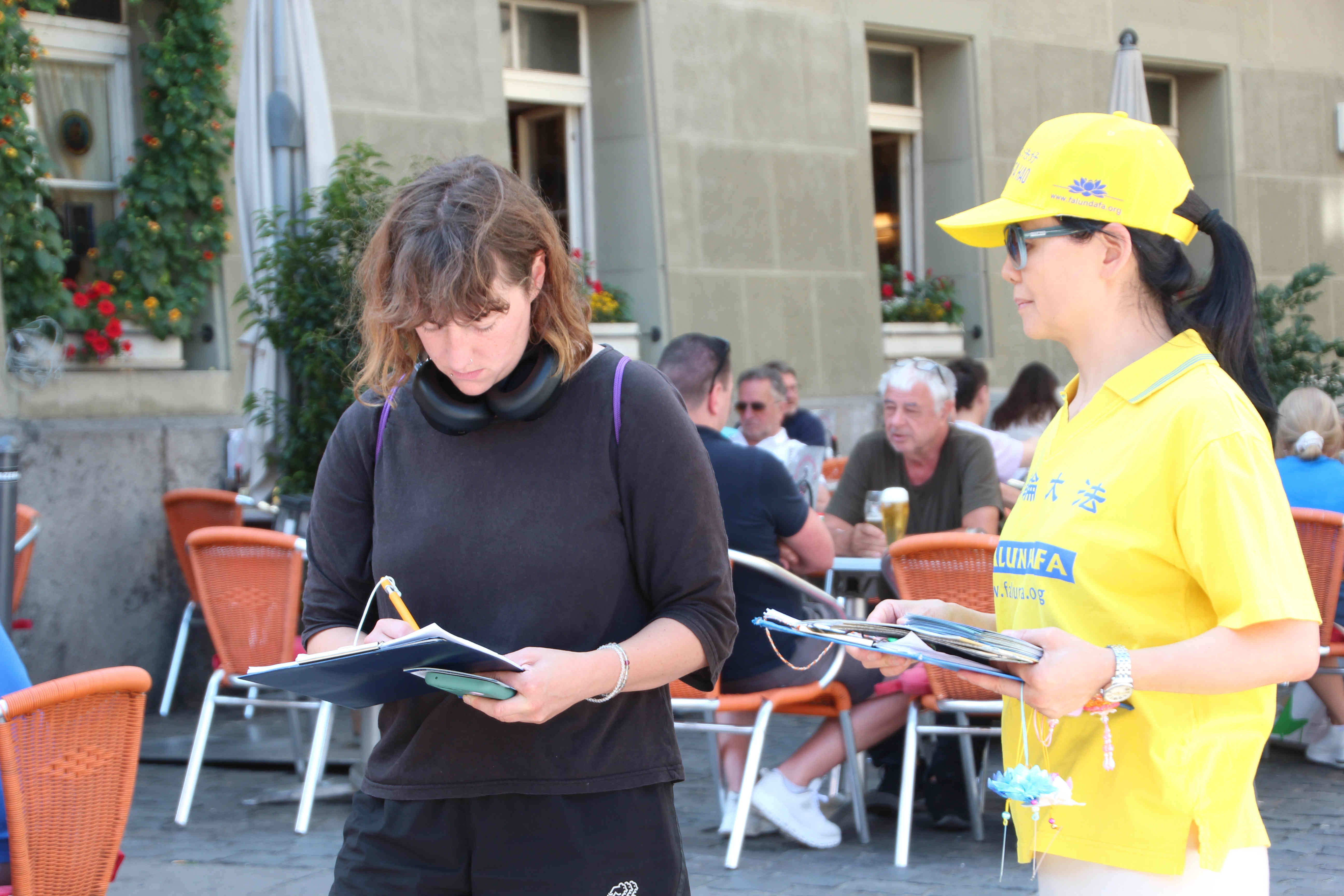 同样是在咖啡店室外座享用美食的皮耶丽娜·雷米(Pierina Raemy)和她的朋友,看着学员们平静地做着舒展的动作,聆听着学员们播放的演讲后,她们主动过来向发送资料的学员询问征签表。仔细阅读后,她们签上了自己的名字,并继续阅读得到的法轮功资料。