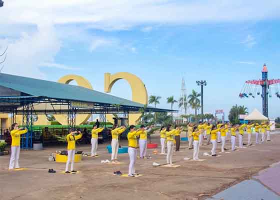 七月二十三日星期日,巴淡市法轮功学员聚集在巴淡市旅游胜地新陶笛,揭露中共对法轮功长达二十四年的迫害。