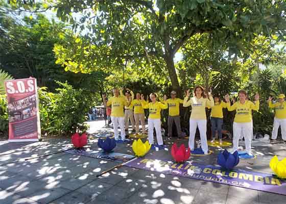 七月二十日,部份来自哥伦比亚的法轮功学员在第二大城市麦德林的探索公园内举办集体炼功和讲真相活动,纪念法轮功反迫害24周年。