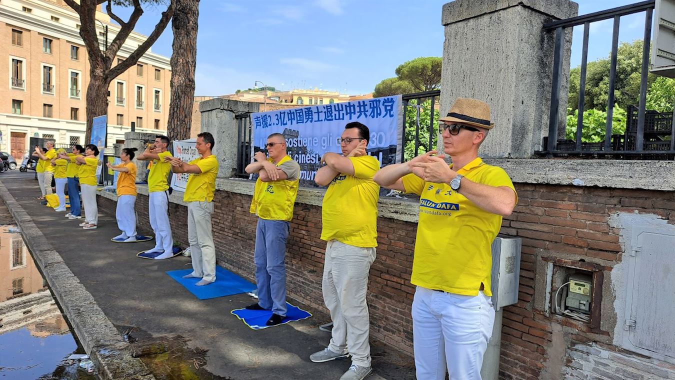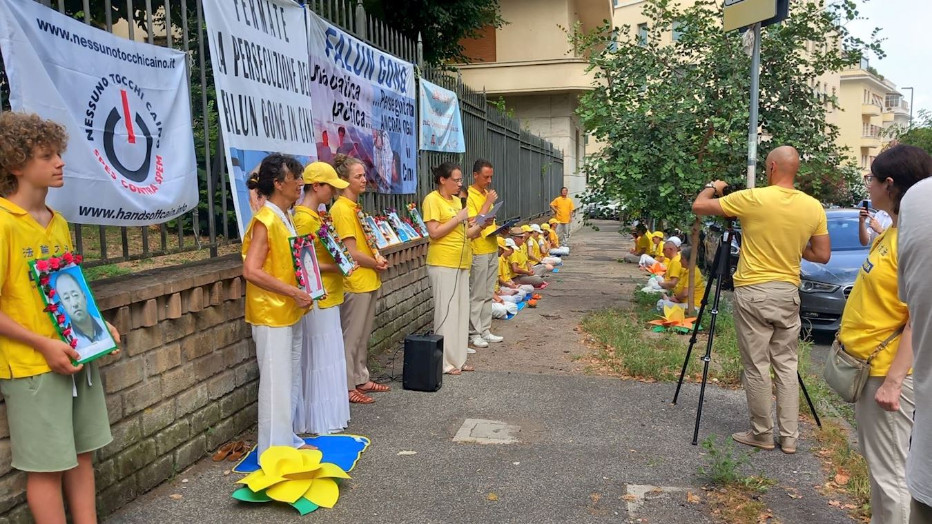 二零二三年七月二十一日上午九点开始,法轮功学员在罗马中共大使馆外举行和平抗议活动,揭露中共对法轮功学员长达二十四年的残酷迫害,呼唤社会正义良知,共同制止迫害。