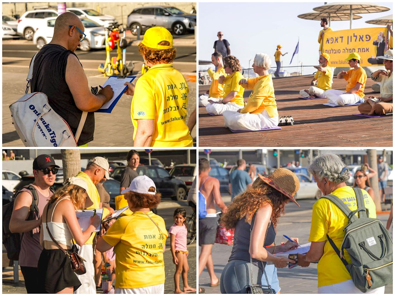 图1:二零二三年六月二十四日,以色列法轮功学员在特拉维夫的中央海滩上举办弘法、讲真相活动,并征集签名呼吁人们支持制止中共迫害法轮功。