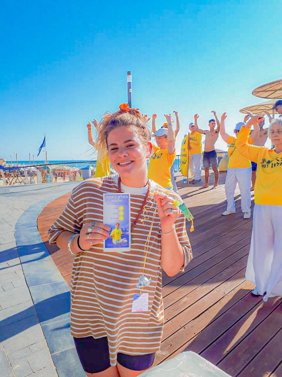 十八岁的高中生诺伊(Noy)来自以色列中部小镇内斯·齐奥纳(Ness Ziona),她说自己与法轮大法真善忍的原则紧密相关:“看到这些修炼者所做的事情,我感到平静和安宁。”