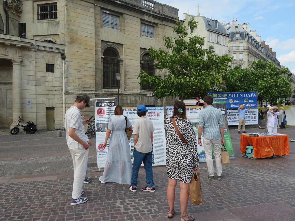 【明慧网二零二三年八月一日】(明慧记者周文英巴黎报道)二零二三年七月的最后两个周末,法轮功学员分别在巴黎中心地带的夏特莱(Châtelet)街区,和圣米歇尔广场集体炼功,并向过往的行人介绍法轮功,揭露中共对法轮功持续至今已有二十四年的迫害