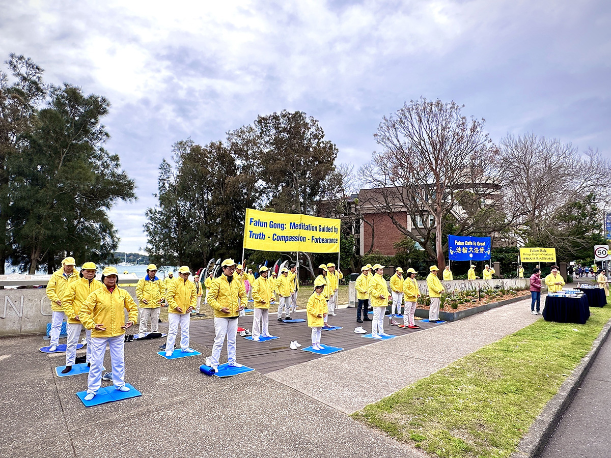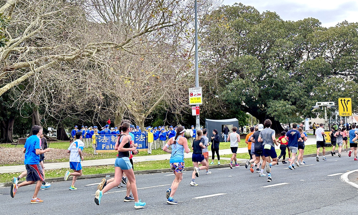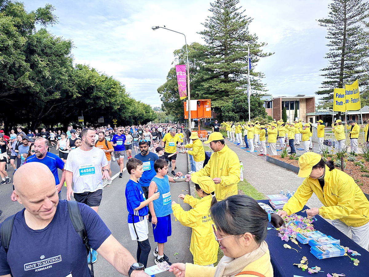 ![]() 图1~6:“从城市到海滩”(City 2Surf)慈善马拉松长跑途中,如潮水般的赛跑者汹涌而至与祥和的法轮功学员的晨炼在动静中相映成辉 |