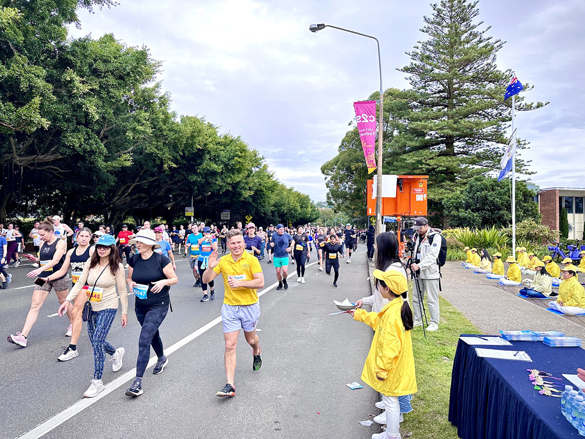 当潮水般的赛跑者汹涌而至时,他们被法轮功纯正祥和能量吸引,有的人表示:这是美丽无声的信息,真了不起!