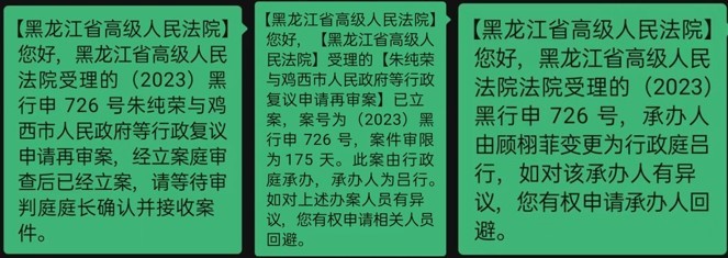 二零二三年三月二十八日,朱纯荣将再审申请递交黑龙江省高级法院立案庭,六月十五日,经审查后立案。六月二十一日,省高法信息告知朱纯荣,行政审判庭法官已经确认受理此案。