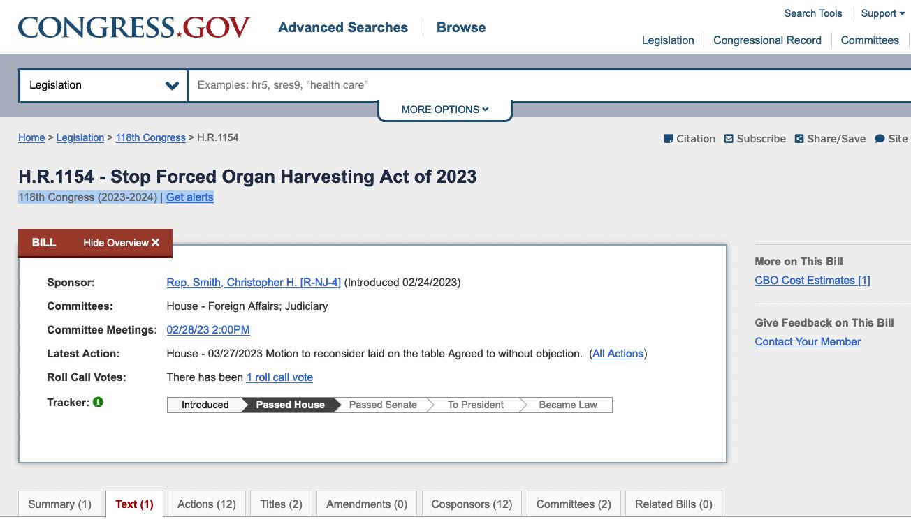 二零二三年三月二十七日,美国联邦众议院以413票对2票通过了《2023年停止活摘器官法案》(Stop Forced Organ Harvesting Act of 2023),惩罚活摘器官罪行。
