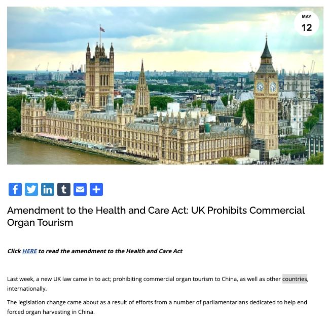 二零二二年四月底,一项新的英国法律——《健康和护理法案》(the Health and Care Bill)正式生效。该法律基于道德风险,禁止英国公民和英国国民前往中国以及其它国家购买器官进行移植。新法还将可能参与器官贩运的英国人,定为刑事犯罪。