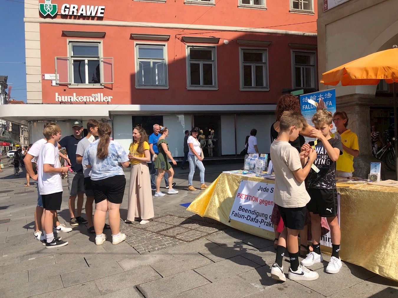 一周前,八月十二日,学员们在奥地利圣珀尔滕(Sankt Pölten)的市中心也开展了讲真相活动。学员们向民众讲述了法轮大法的美好并揭露中共对法轮功的迫害。了解真相的民众纷纷为反迫害签名支持。