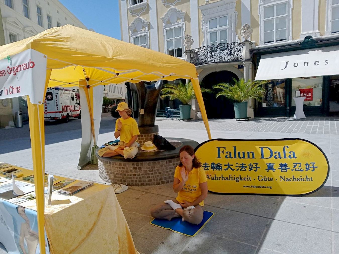 法轮功学员经常到圣珀尔滕市讲真相。八月十二日,他们又一次在繁华的商业街上搭起真相点,几家商店的店员都表示很愿意让学员在自己的店里摆放真相材料,支持法轮功学员反迫害。
