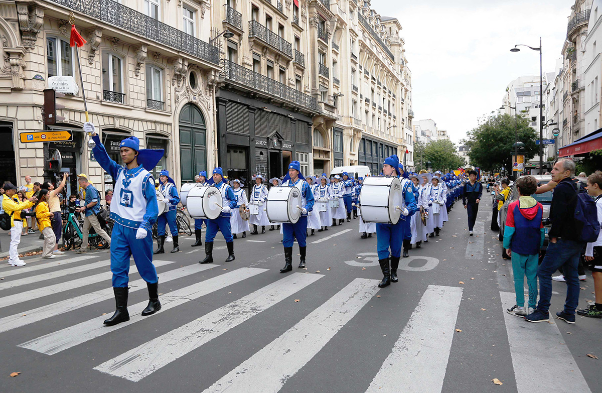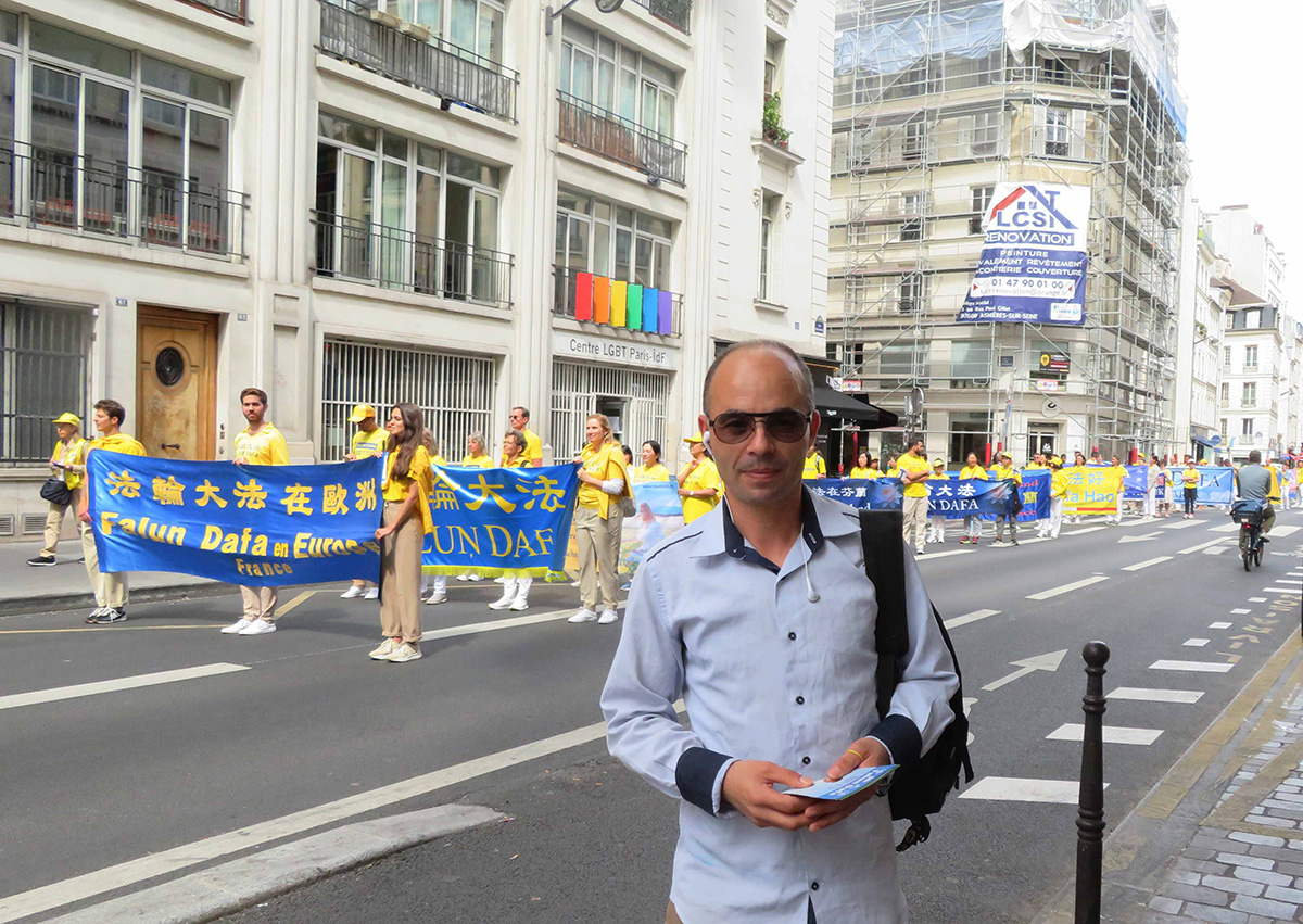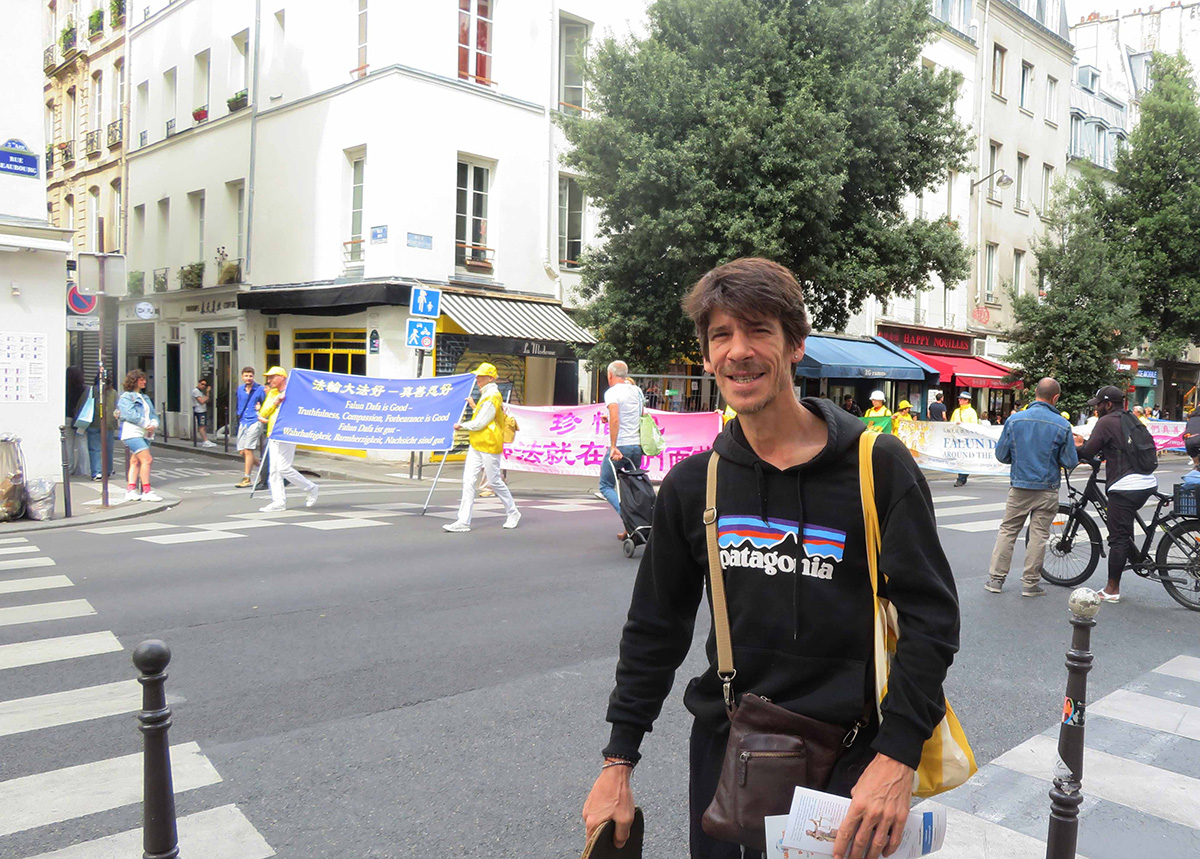 法国民众亚齐德·杜阿齐(Yazid Douazi)在博堡街看完了游行的全程。他说:“对人类来说,真、善、忍是很好的价值。这样的游行很好,可以改变世界。”