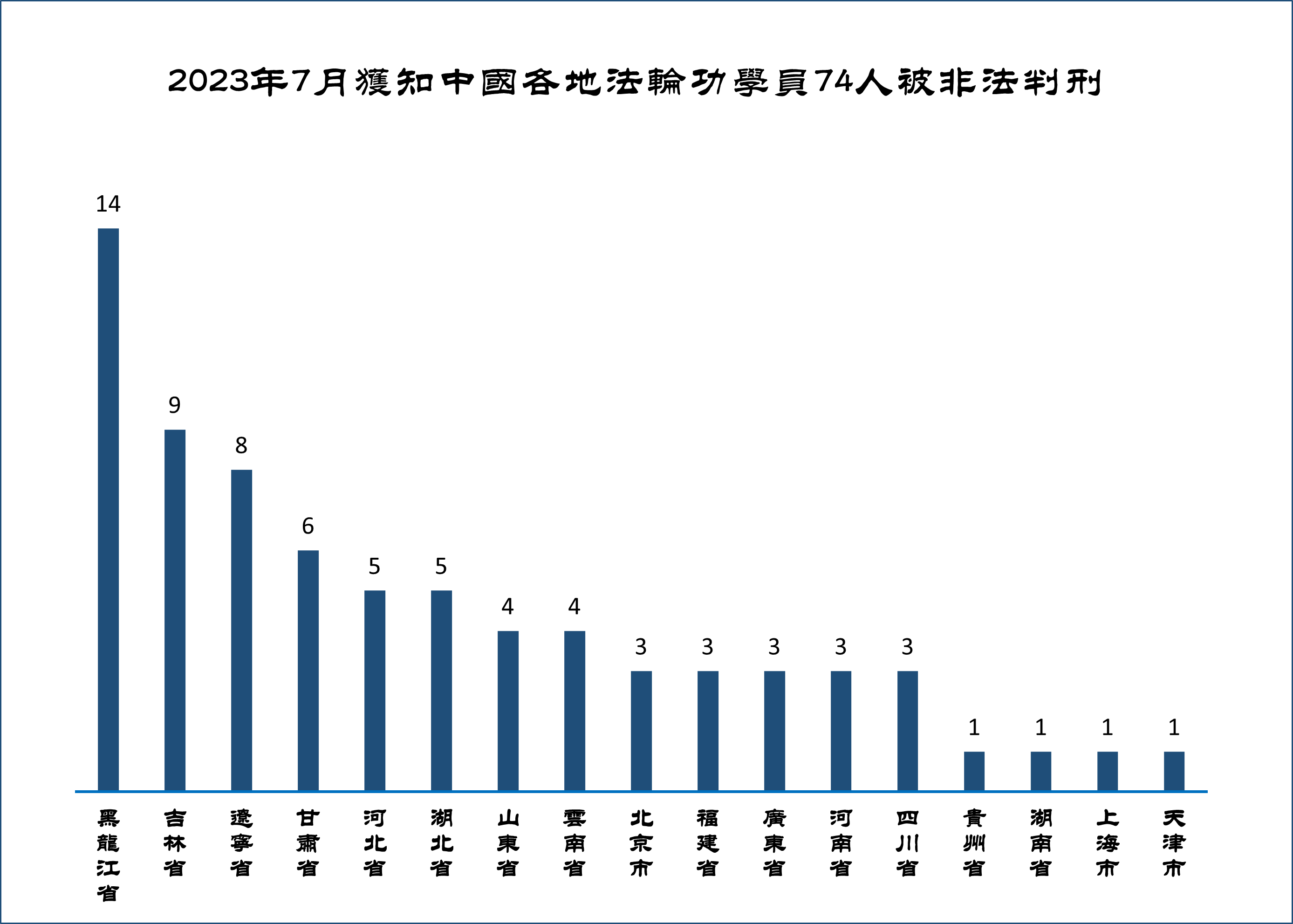 ![]() 图1:2023年7月获知中国各地法轮功学员74人被非法判刑 |