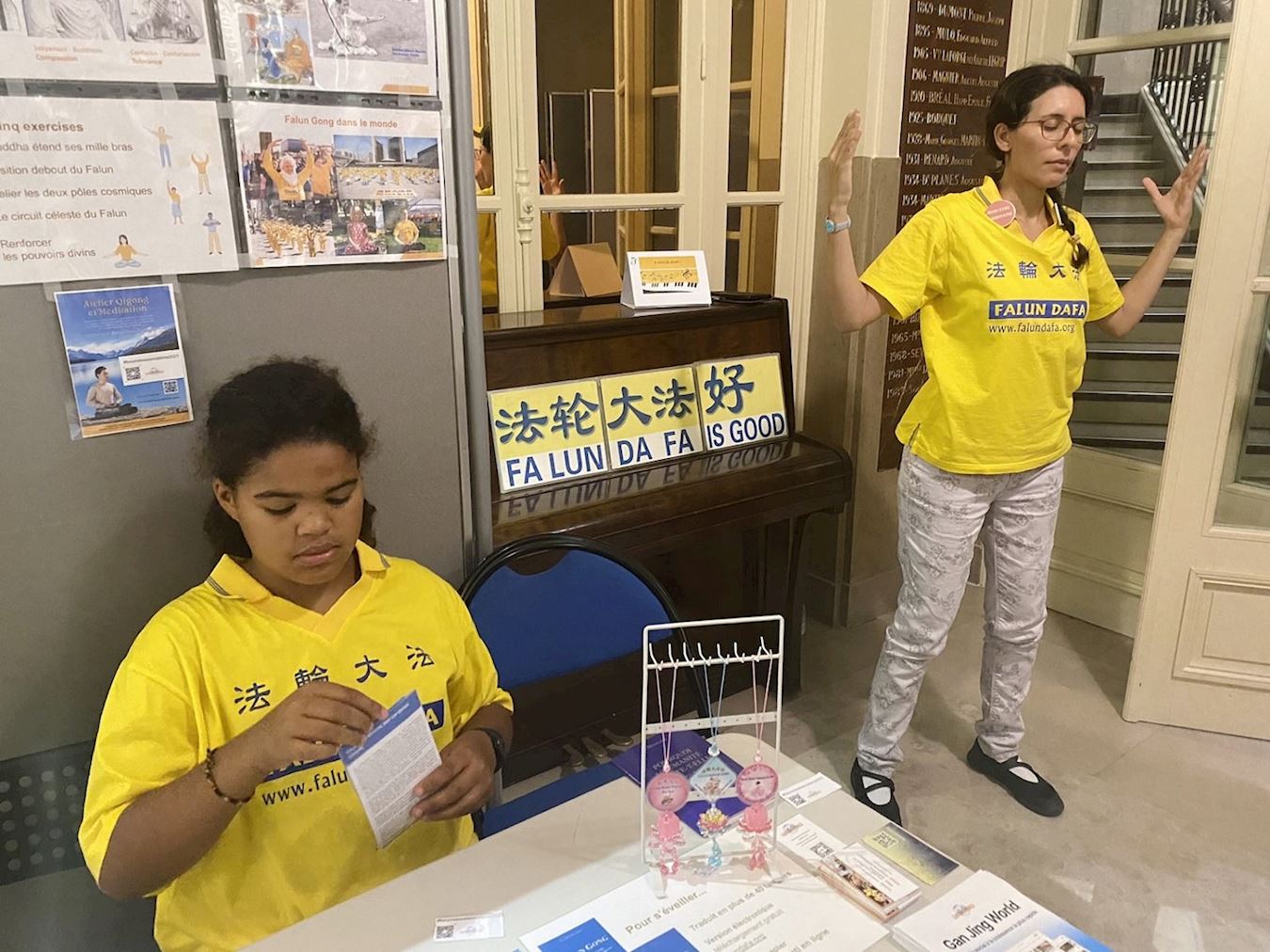 图1:二零二三年九月九日,在巴黎第五区区政府内,法轮功学员向到访者介绍法轮功。
