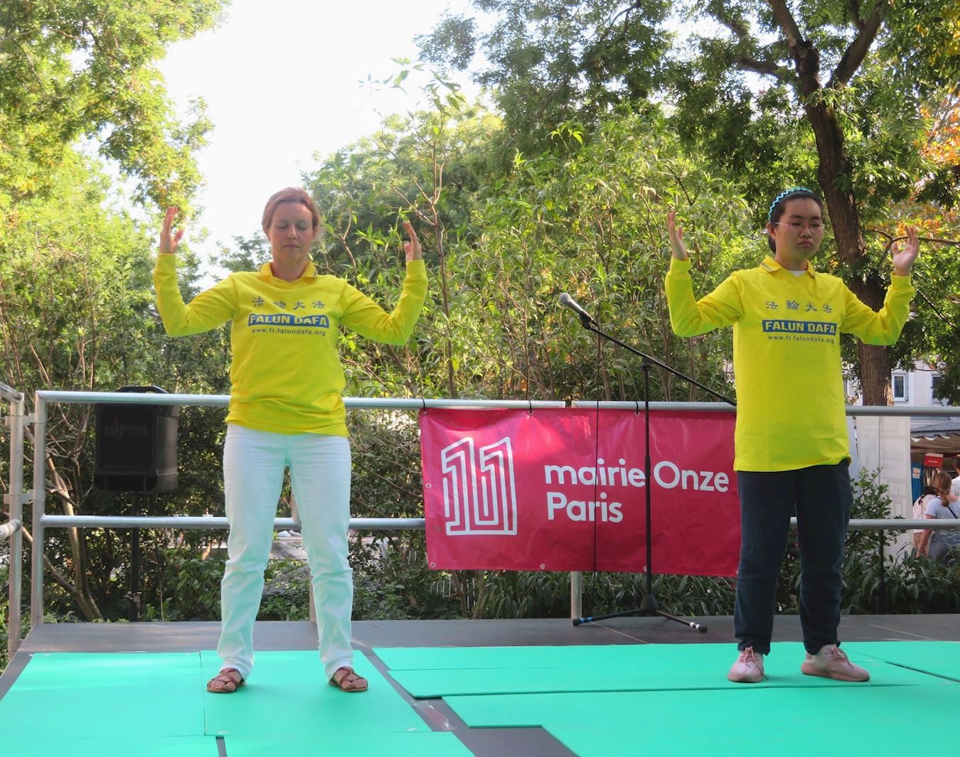 '图6~7:法轮功学员在巴黎十一区协会论坛活动上向参观者演示法轮功功法。'
