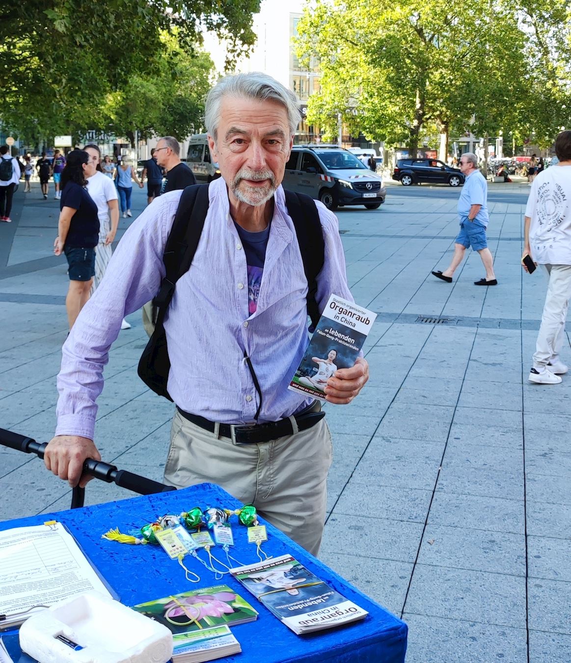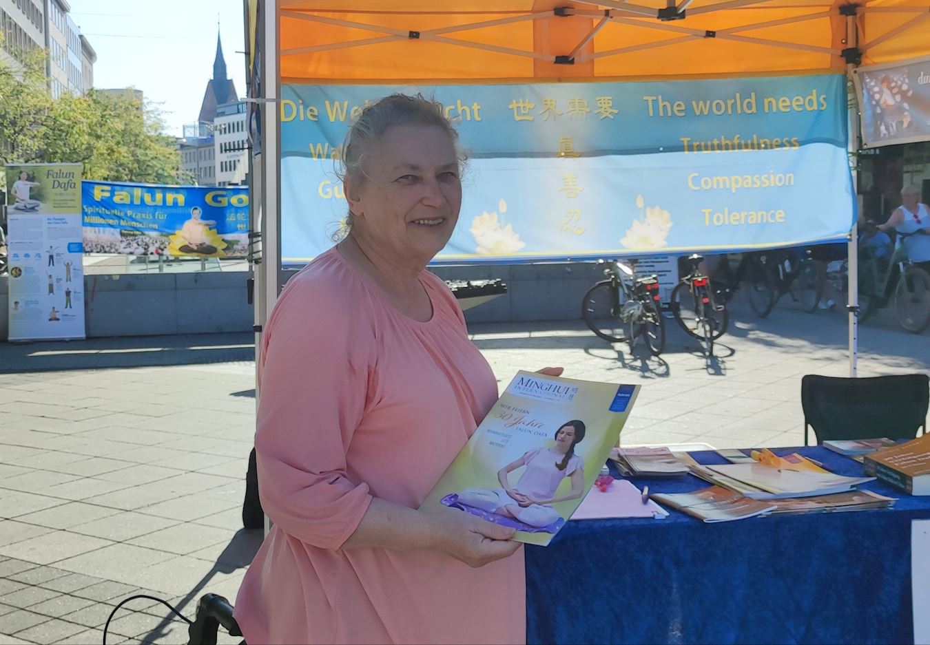为反迫害签名时,这位女士开始有些担忧,觉得“自己人微力薄”。这时一位学员告诉她,通过签名,她可以明确地表达自己反对这些罪行的立场。让德国政府正式与这些侵犯人权的行为分割开来是非常重要的。通过数以万计的签名,可以做到这一点。