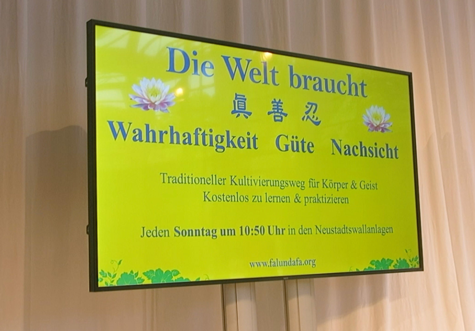 ![]() 图3:博览会的屏幕上显示着“世界需要真、善、忍”以及不来梅学法小组的炼功时间和地点。 |