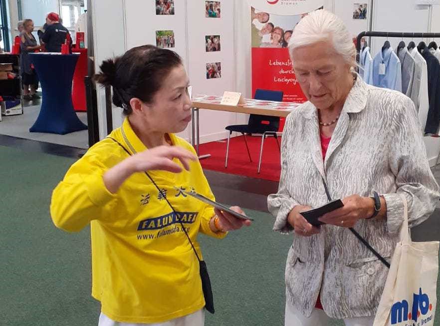 汉娜·吉隆(HannahGilon)是不莱梅展览馆的销售员兼协办方。她说:“我们非常希望能拉近参观者与我们的主题之间的距离。法轮大法充实了(我们的展会),我们的博览会是应该展示打坐,以及它带来的益处。在我们的主舞台上展现法轮大法是非常有价值的,很多参观者都跟着学了动作。”