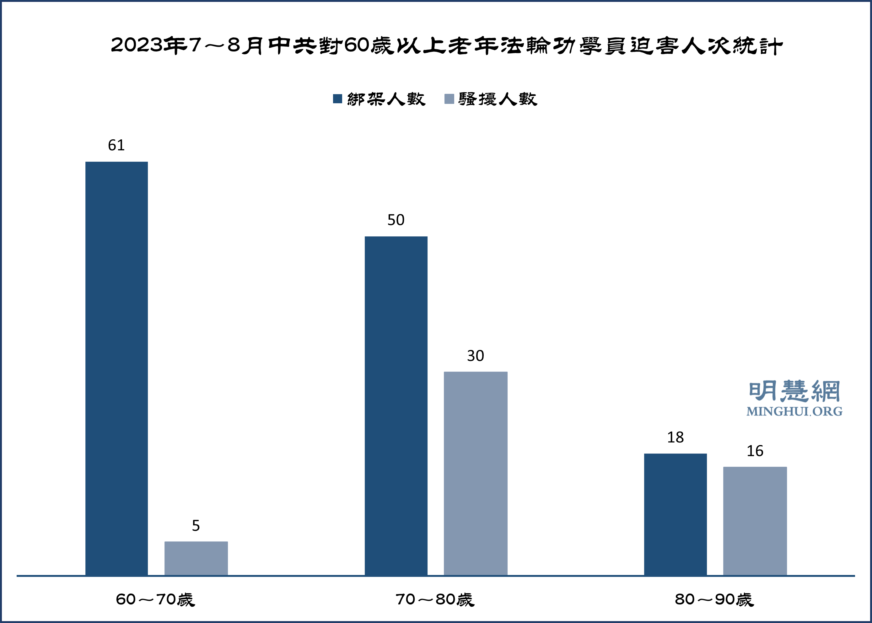 ![]() 图1:2023年1~8月明慧网报道中国大陆法轮功学员遭绑架骚扰迫害人次统计 |