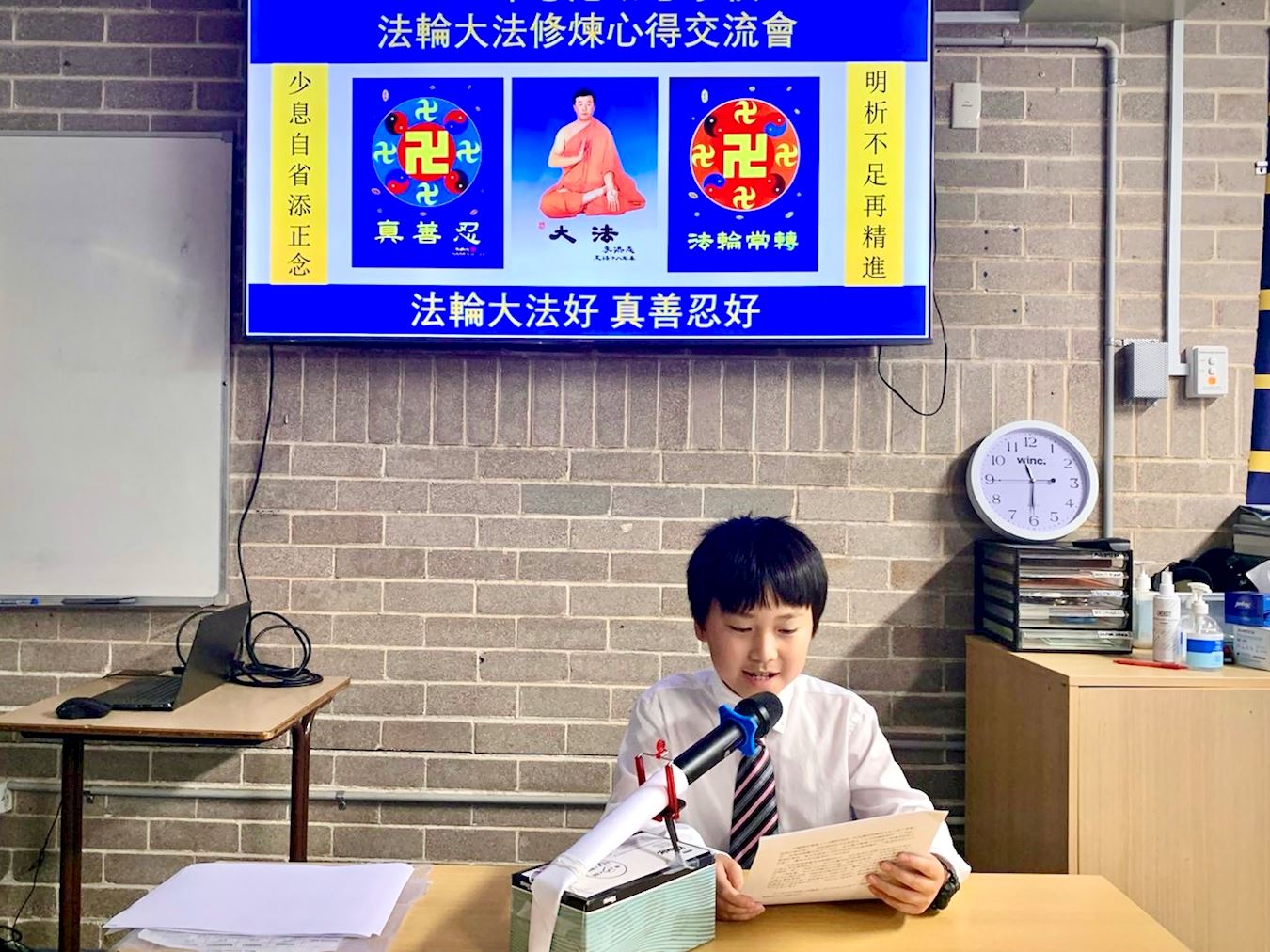 而另一位初级班的瀚轩,说他有一次在姨妈的车里,哮喘病症状发作,当时几乎无法呼吸,用吸入器也没有用。姨妈让他向师父求救,他就在心里喊:师父,救我!大约五分钟后,他的呼吸恢复正常。他对姨妈说:“有用!师父帮助我好起来了!”那时“我对师父的感激之情让我的眼睛湿润了”。