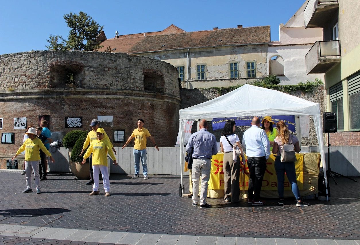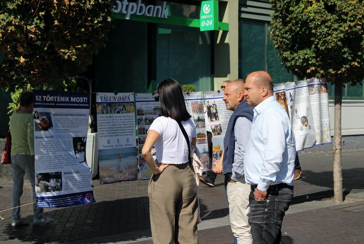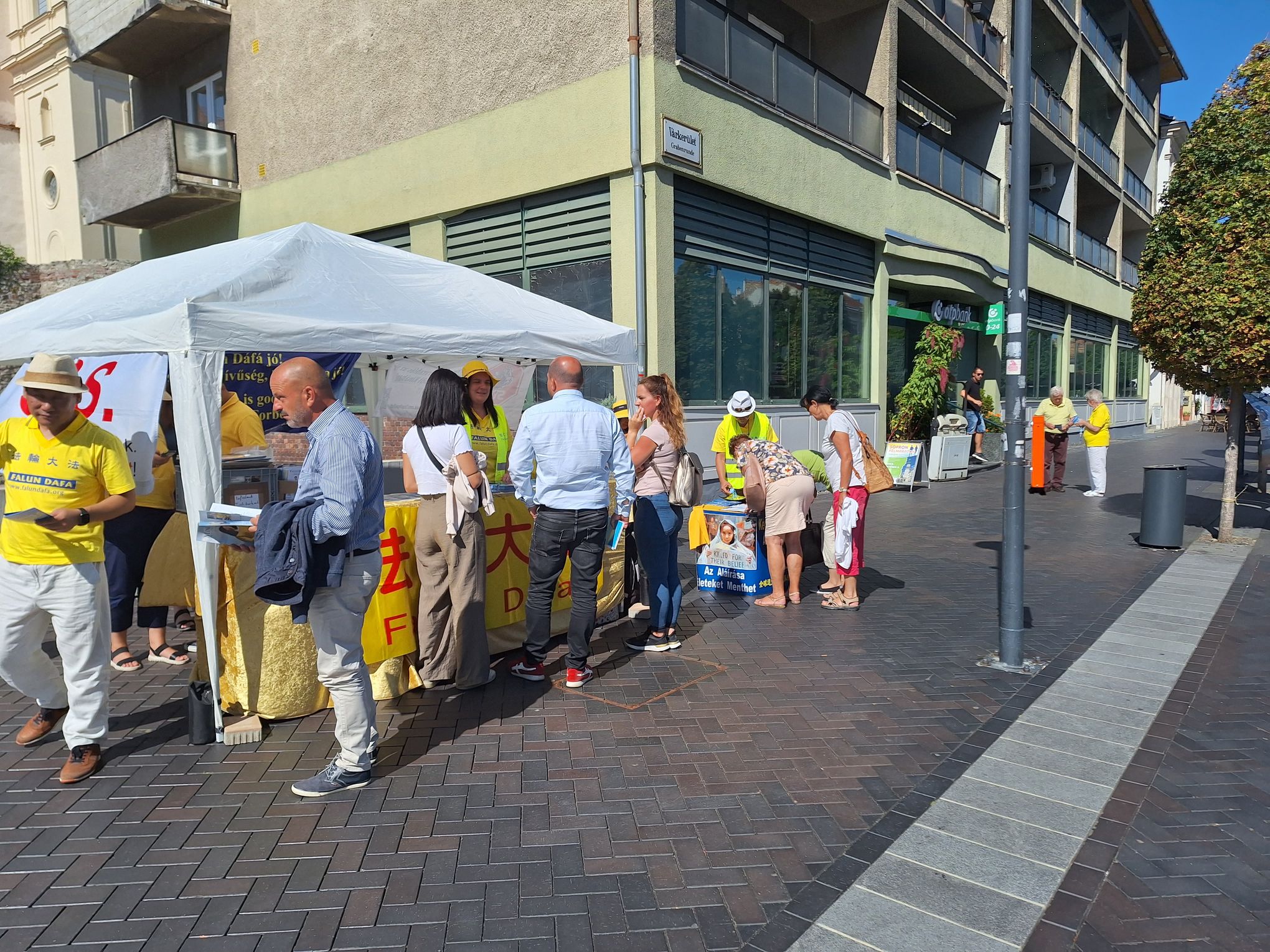 索普朗是奥地利和匈牙利居民都喜爱的周末旅游地。学员们在市中心的城堡区设立了讲真相展位,并在展位周围悬挂展板。过往的人们纷纷停下来阅读展板上的信息,了解法轮大法及中共对法轮功的迫害,他们还与学员们交谈。