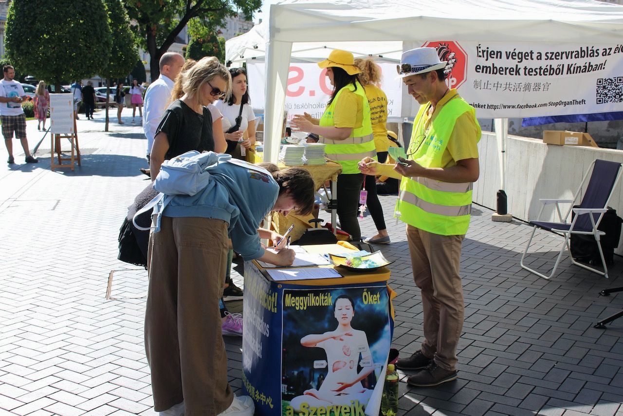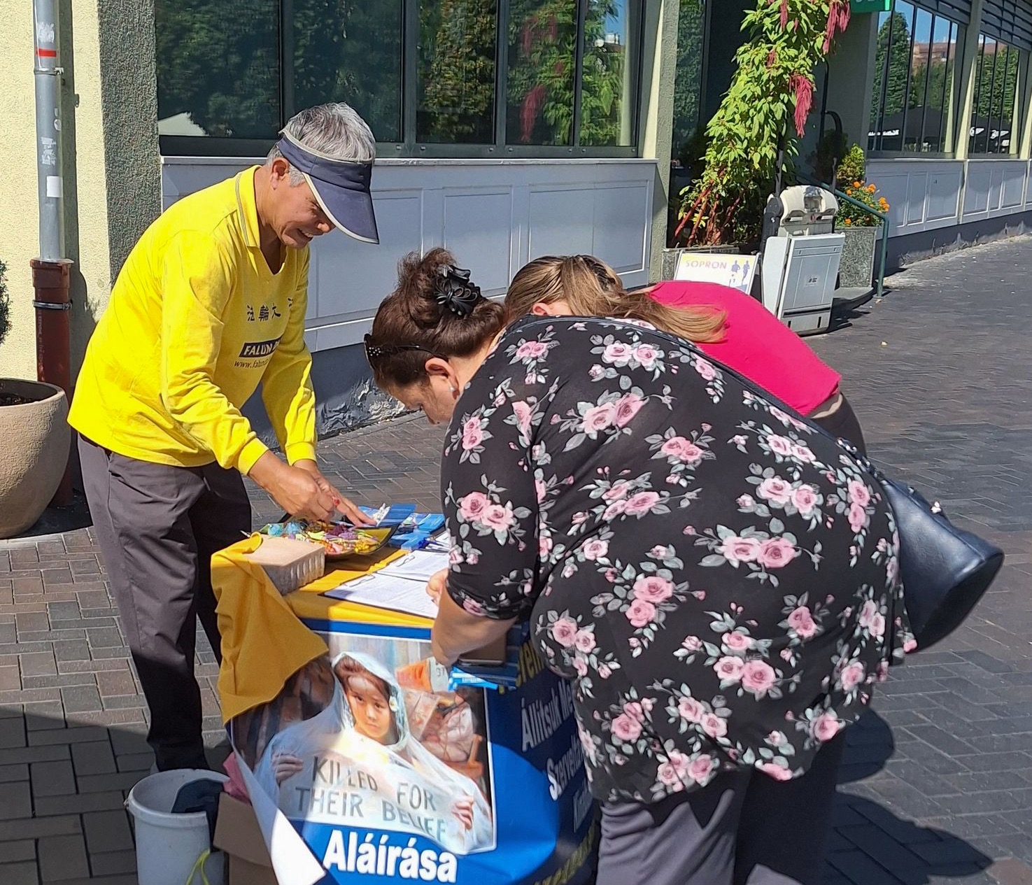从学员那里了解了法轮大法后,两位老年妇女在请愿书上签了名,请愿书呼吁匈牙利政府对中共迫害法轮功以及活摘法轮功学员器官予以谴责。