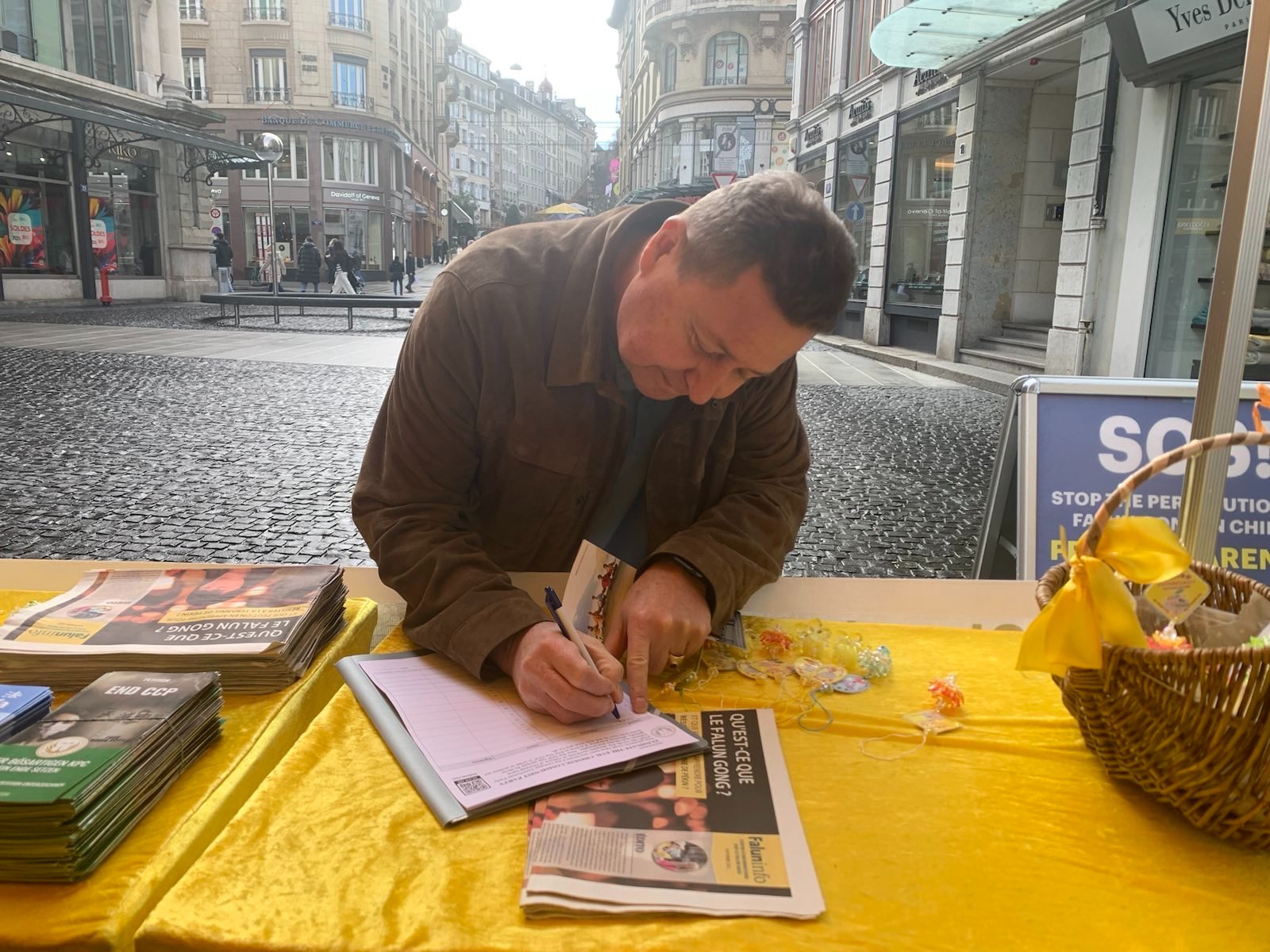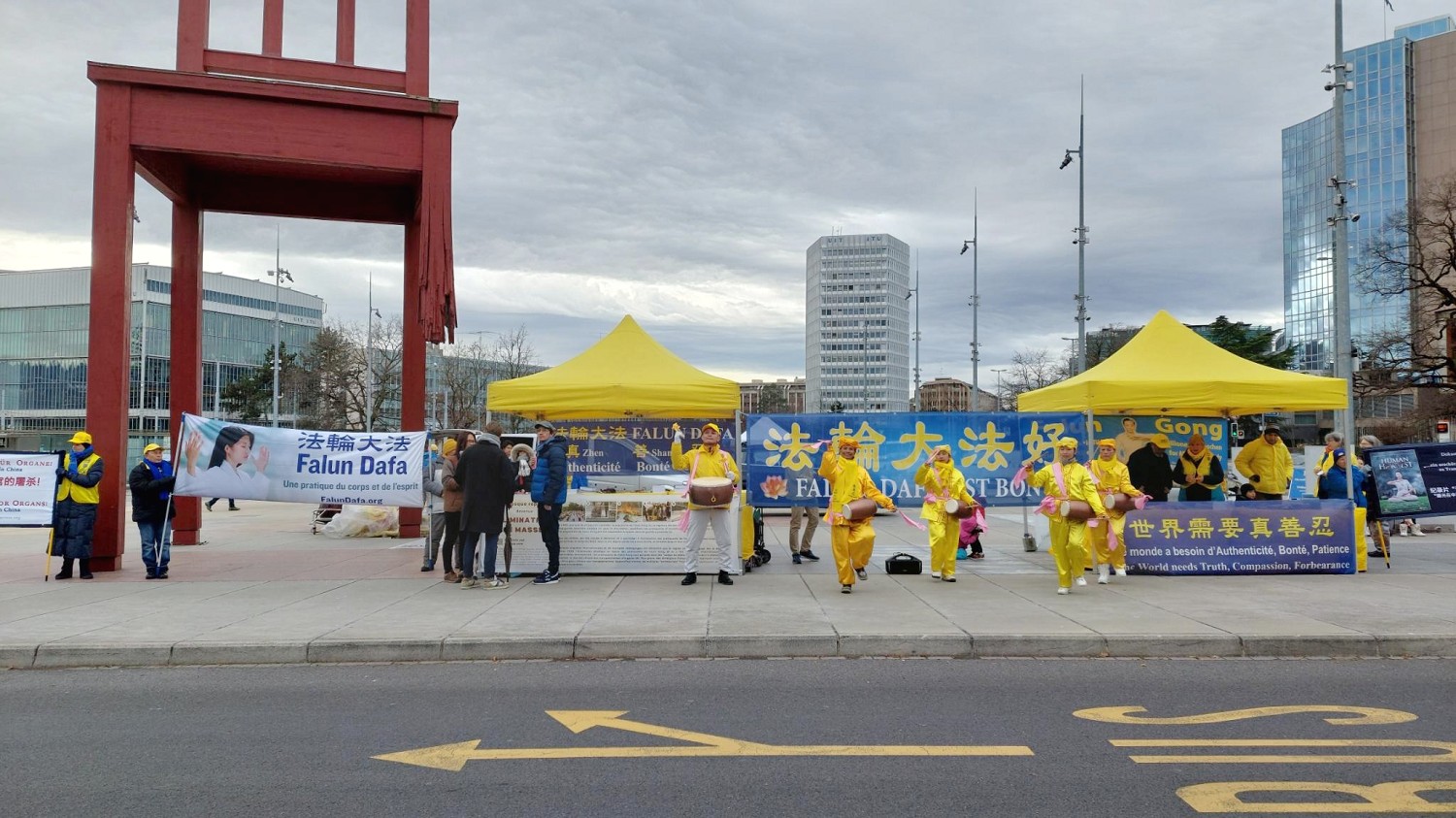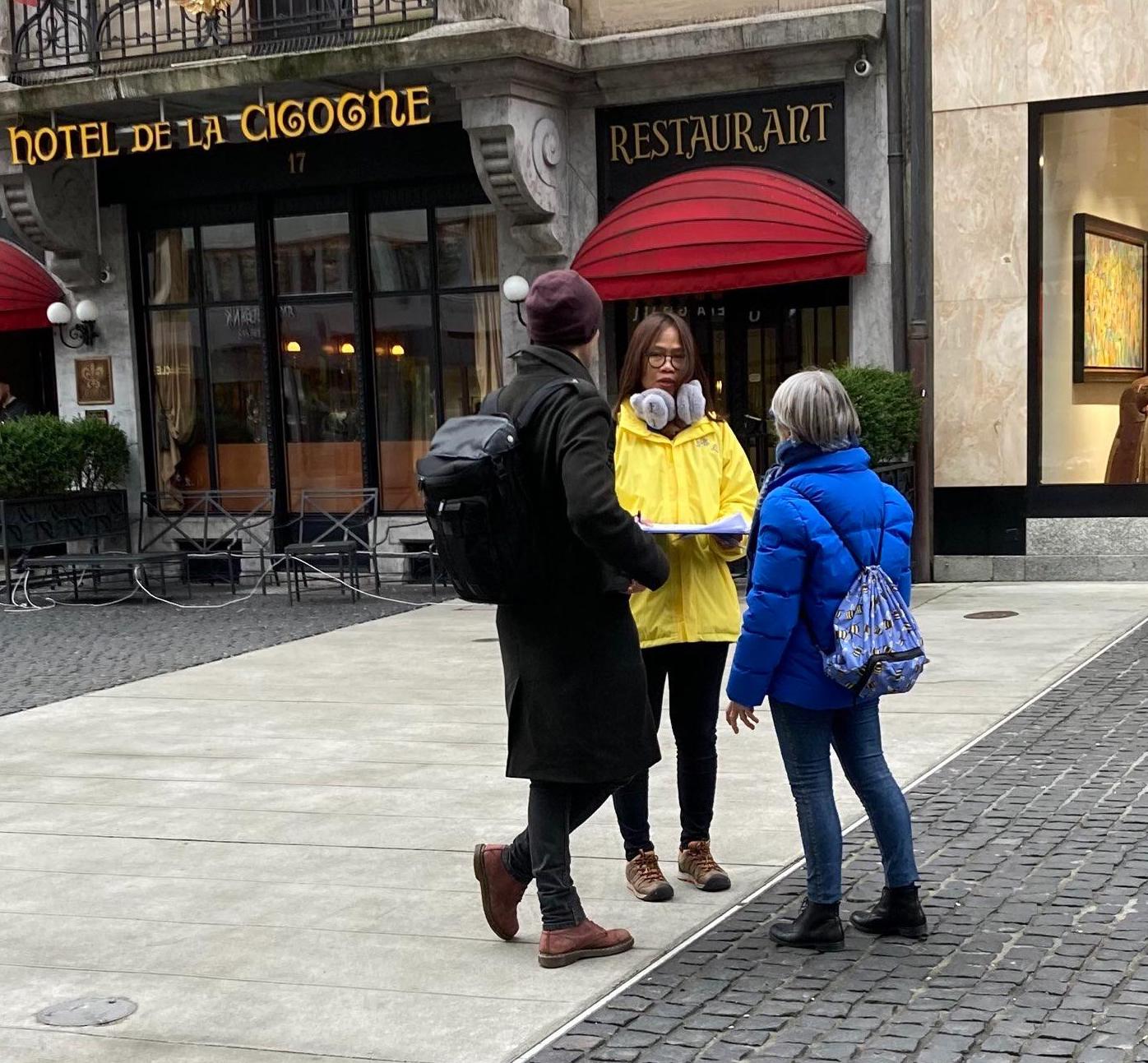 尽管天气寒冷、下着雨,法轮功学员仍坚持讲真相,举行反迫害征签活动。学员向许多国际官员和游客展示五套功法传递法轮大法的美好,同时揭露中共长期迫害法轮功的真相。许多国际人士及游客驻足观看,有的和学员交谈,询问更多关于法轮功的讯息,有的表示想学炼法轮功功法。