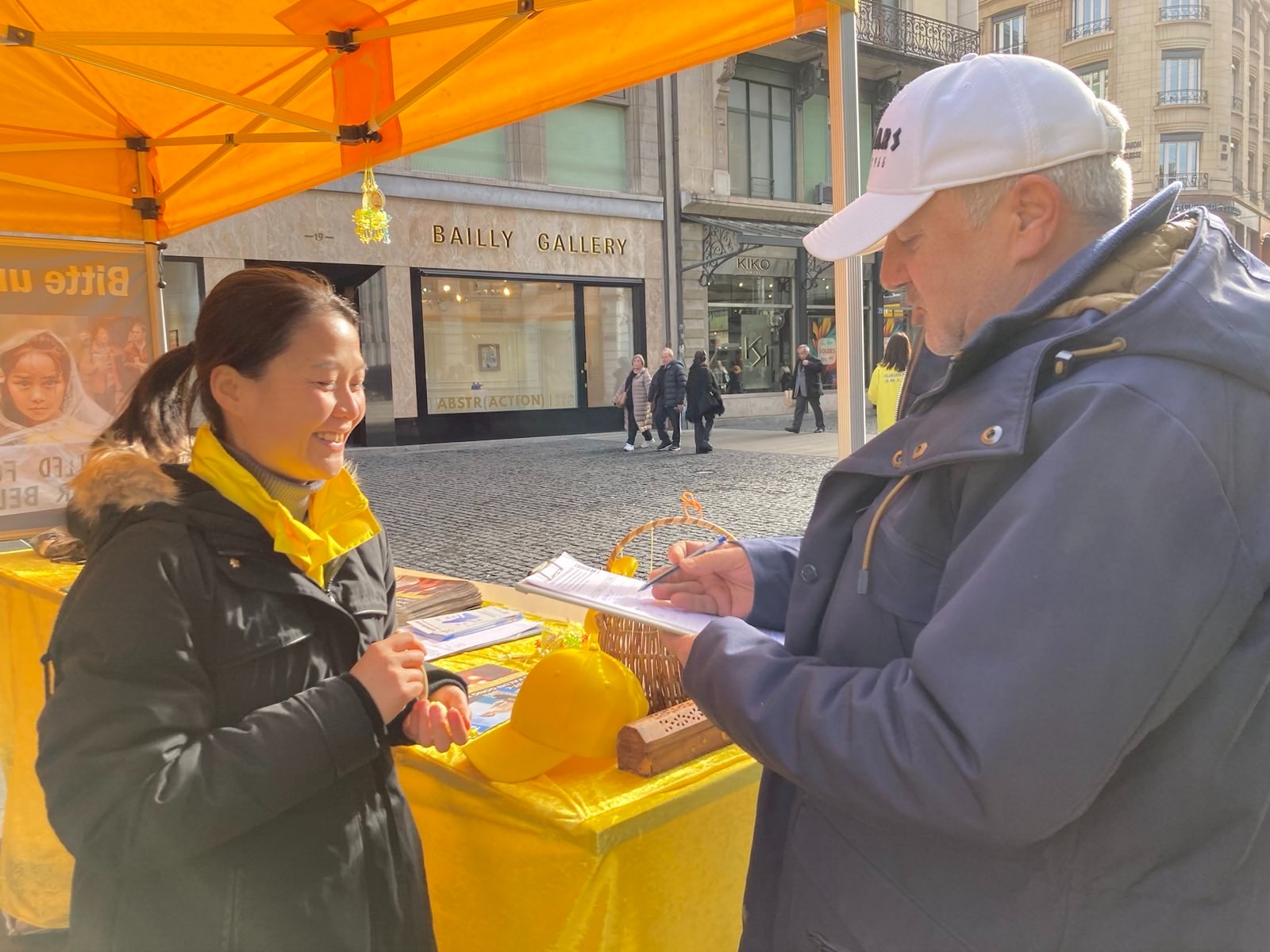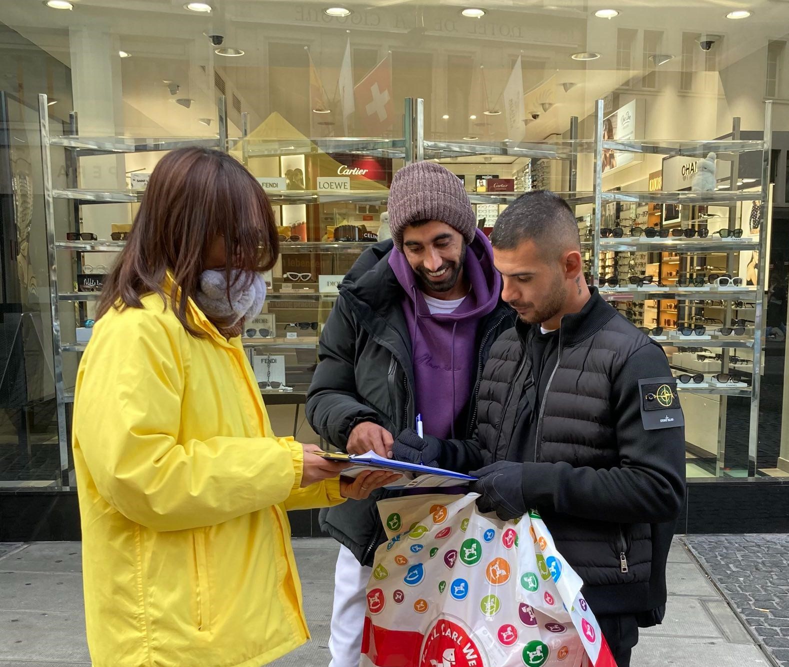 法轮功学员们告诉来往的路人什么是法轮功,以及发生在中国大陆中共对法轮功学员的迫害。路人得知真相后震惊不已,纷纷在停止迫害法轮功的请愿书上签名。
