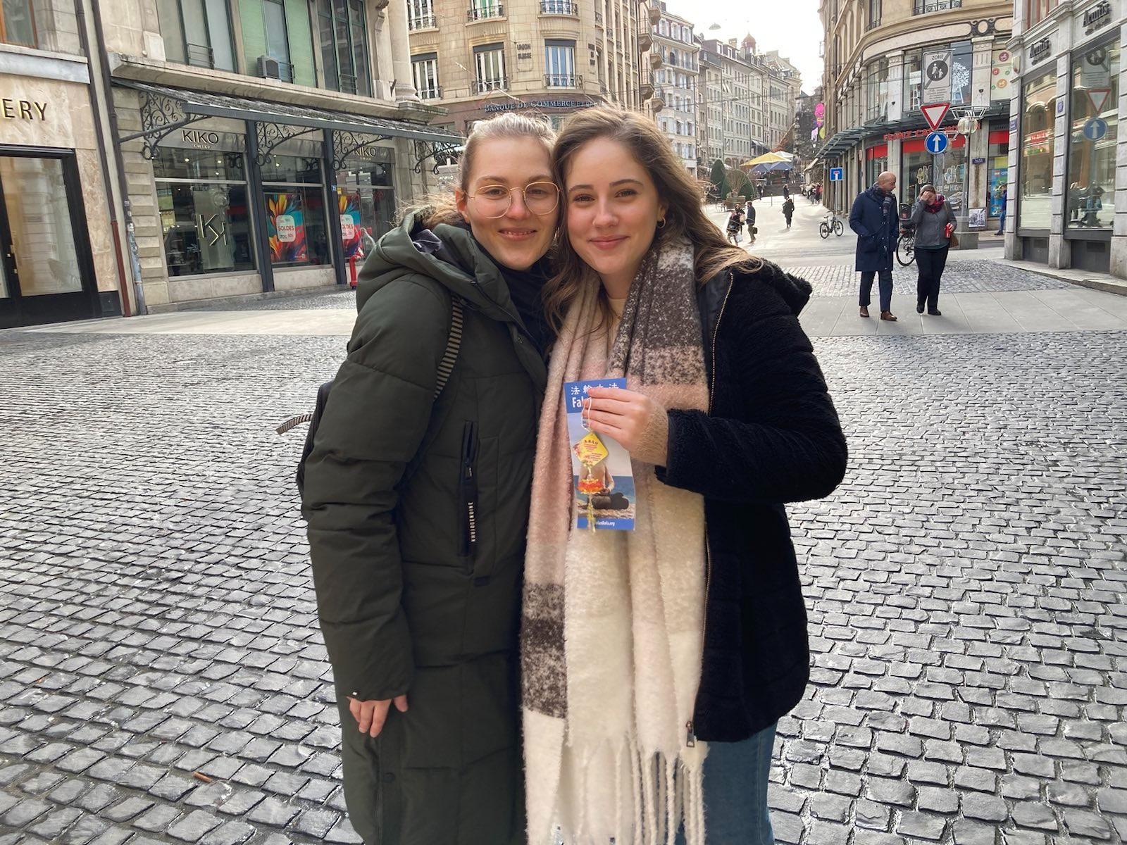 在万国宫前可以遇见来自世界各地的人们。一位女士停下来与一位学员交谈。这位女士来自布列塔尼。她一直在练习气功,但一直找不到自己喜欢的活动。当她听说法轮功时,她说:“啊,我很感兴趣。”学员向她介绍了法轮功的精神层面,关于修炼 “真、善、忍 ”的价值观。