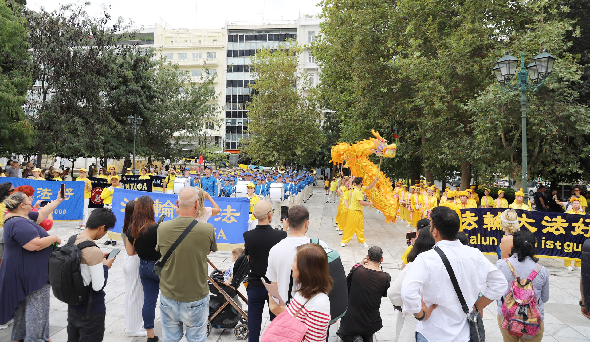 游行路线经过了雅典的众多繁华地区,如政府中心、购物街和博物馆。乐团和鼓手的演奏吸引了路人的关注,他们纷纷拍照并接受学员们递来的法轮大法介绍单张。办公人员也走出大楼,向学员们了解法轮大法的资讯。