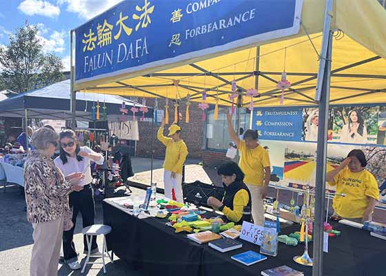 法轮功学员十月五日参加了梅休因的巿镇节庆祝活动。他们演示优美的功法动作,同时向人们介绍法轮大法,并揭露中共对法轮功的迫害。