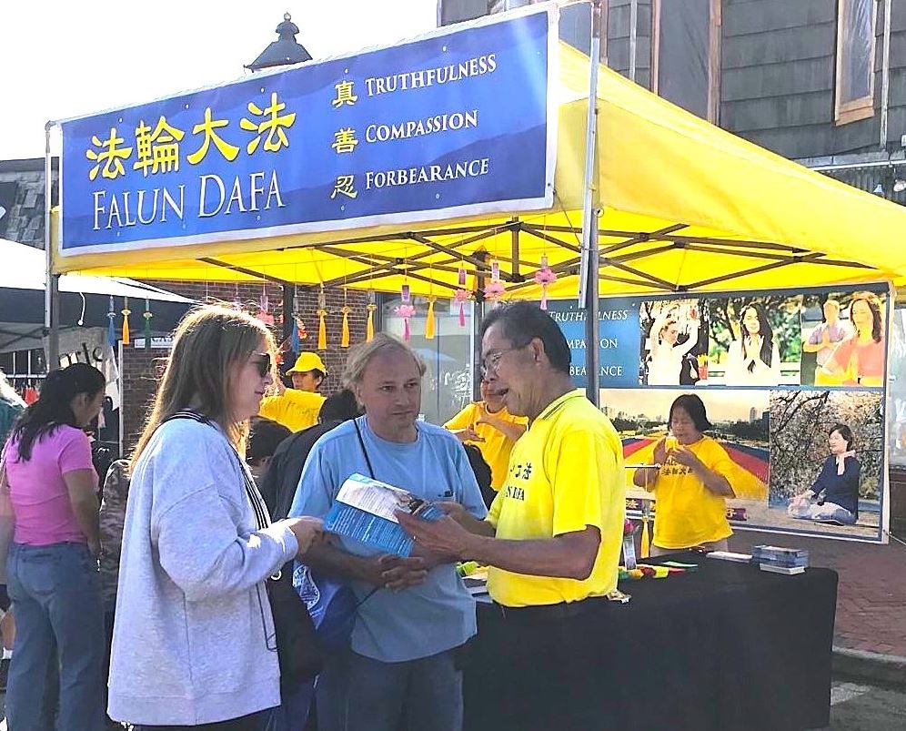 当天有不少人被法轮功的动作所吸引。两位住在老人公寓的女士路过法轮功展位,看到学员们在炼功,她们觉得这些动作特别平静、优美。她们马上在脸书上查询什么是法轮大法,随后决定回到摊位跟学员们要名片。其中一位叫米莉(Millie)的太太说:“你们的动作真是太平静、优美了!我们希望你们能来我们的活动中心教功。”