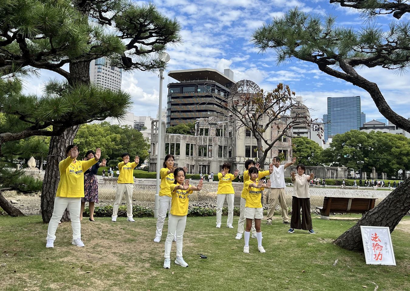 ![]() 图7~8:法轮功学员在广岛和平公园的原子弹被爆遗址的河对岸集体炼功。 |