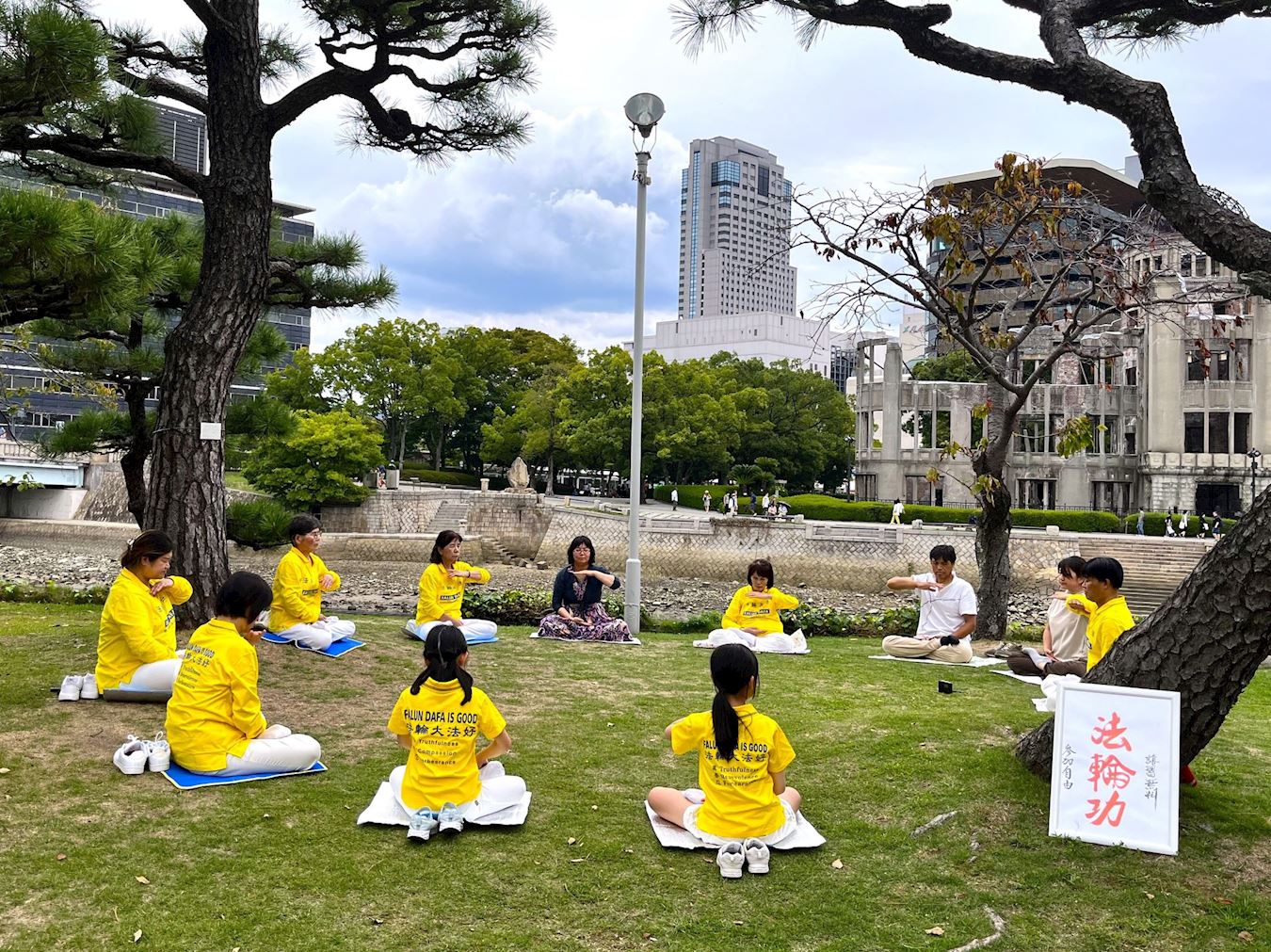 十四日这天是日本全国休息日,络绎不绝的游客和海内外旅游团来到广岛和平公园。有的游客在远处看到学员炼功,就走近驻足观看。来自以色列的夫妇说知道法轮功,但具体不了解,所以夫妇两人各拿了一份资料坐在椅子上长时间详细阅读。来自英国的夫妇说没听说过法轮功,也拿了资料准备回去阅读。