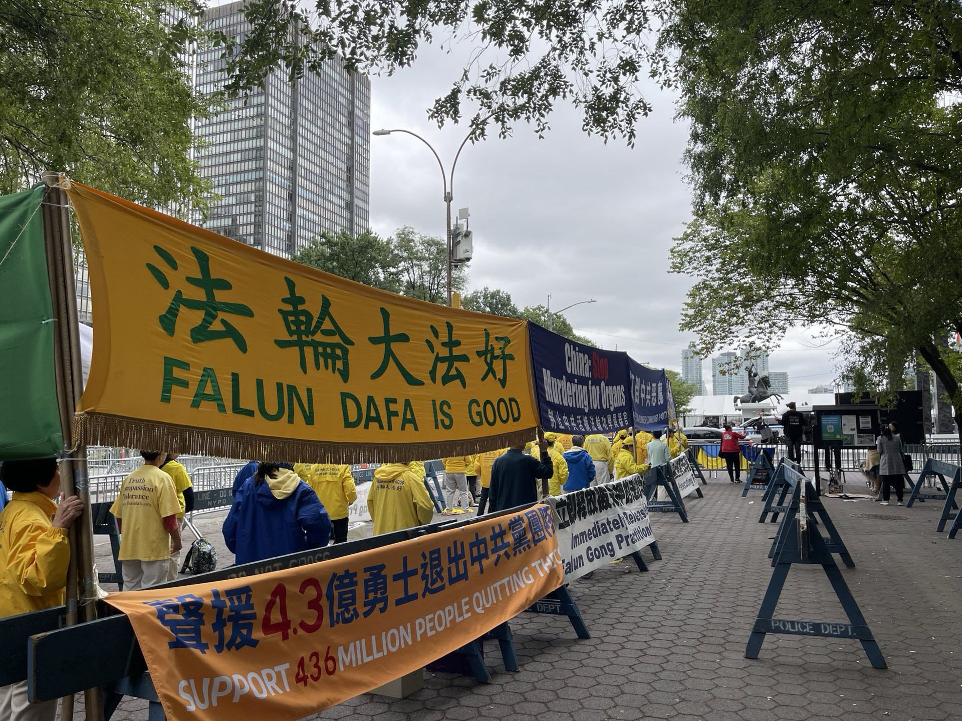 九月二十五日开始,每天早上七点半到晚上七点,纽约部分法轮功学员聚集在联合国总部对面的哈玛绍广场进行集体炼功和展示巨大横幅,同时还在联合国总部周边举行“停止迫害”的车游。