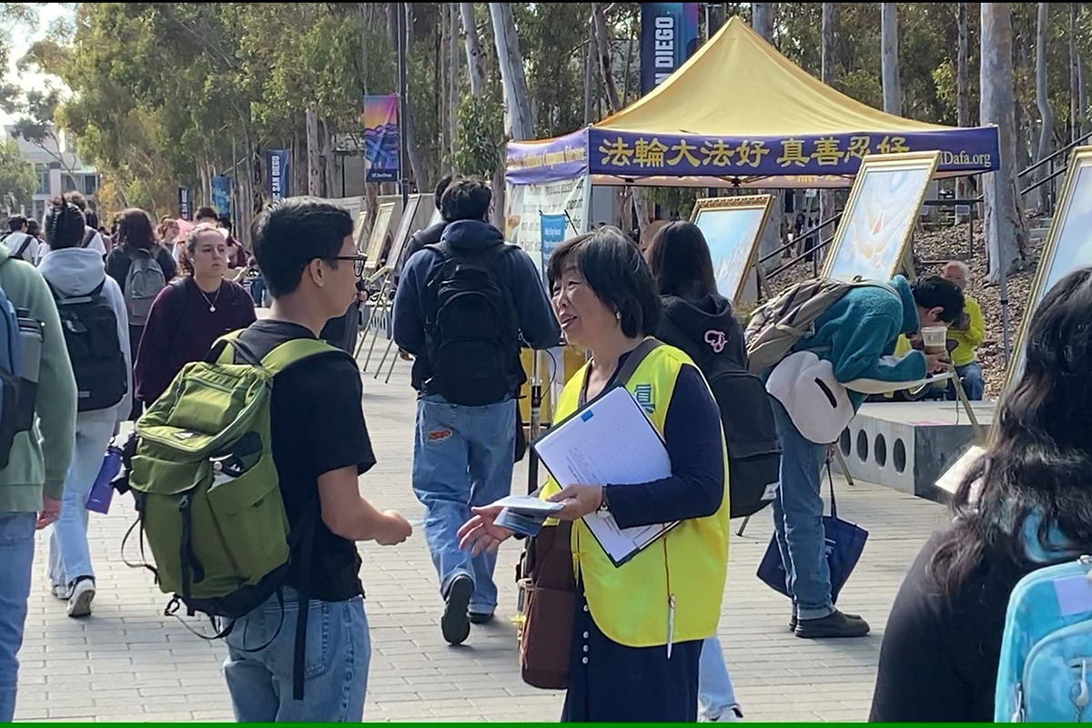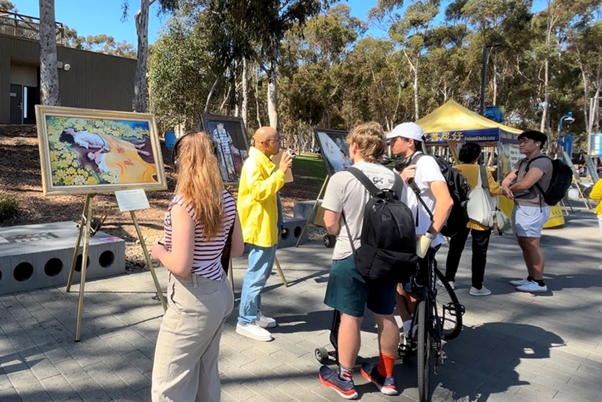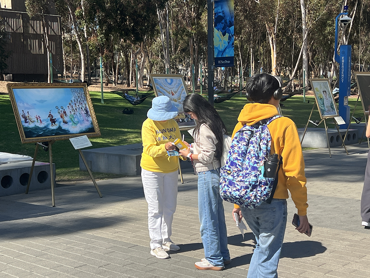 【明慧网二零二四年十月二十三日】二零二四年十月十四日,在美国加州大学圣地亚哥分校(UCSD)校园内,一幅幅真善忍美展的画作在通向图书馆的道路旁一字排开,让过往的学生们有机会了解法轮大法的美好,和正在中国大陆发生的迫害。活动中也同时为支持美国参议院提出的S.4914《法轮功保护法案》征集签名。