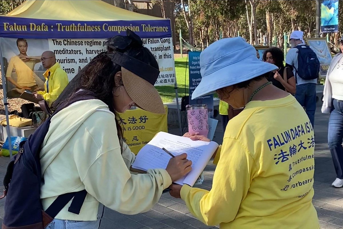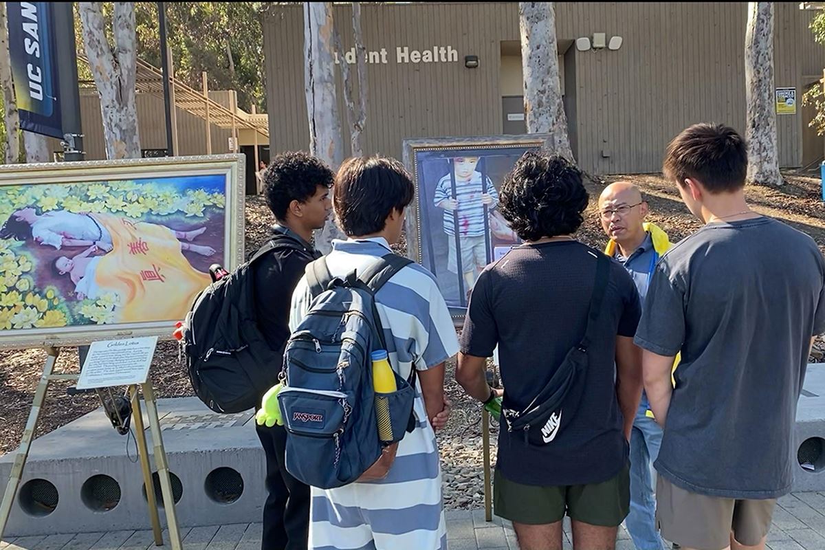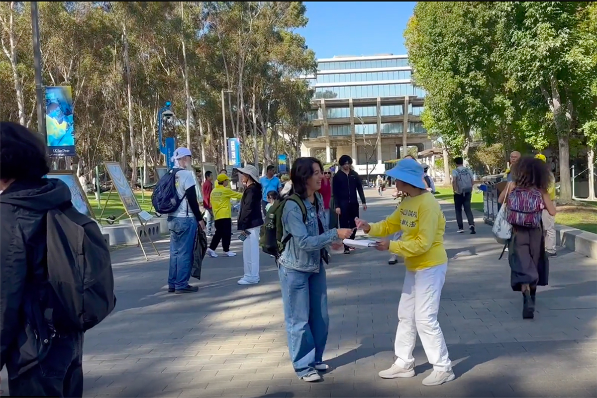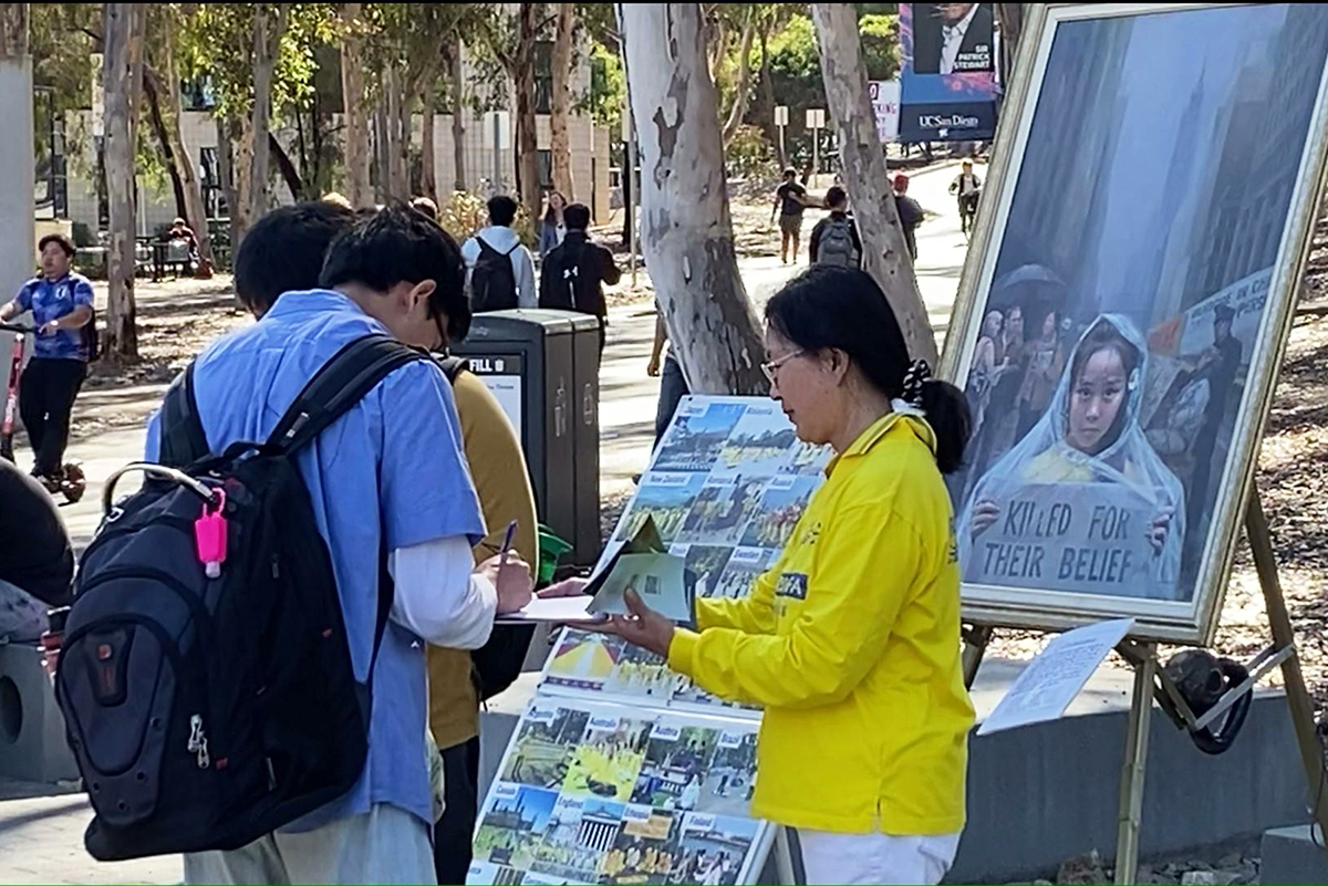 【明慧网二零二四年十月二十三日】二零二四年十月十四日,在美国加州大学圣地亚哥分校(UCSD)校园内,一幅幅真善忍美展的画作在通向图书馆的道路旁一字排开,让过往的学生们有机会了解法轮大法的美好,和正在中国大陆发生的迫害。活动中也同时为支持美国参议院提出的S.4914《法轮功保护法案》征集签名。