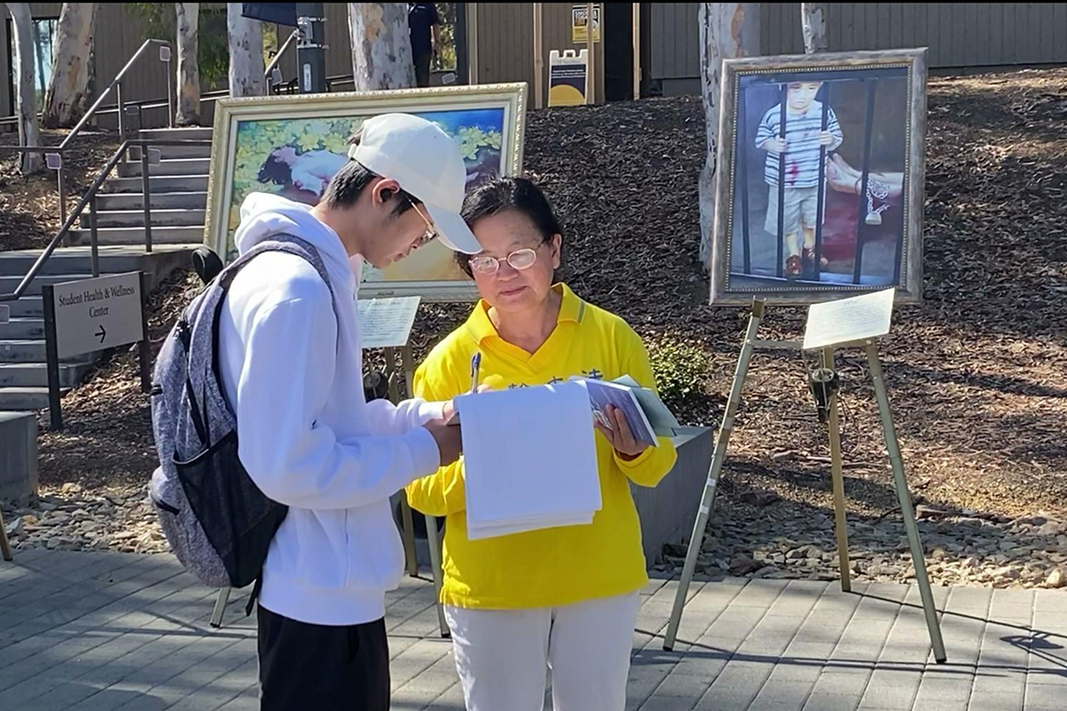 画展所在的“图书馆大道”(Library Walk)上,来来往往的人群中,有很多中国大陆留学生。法轮功学员苏女士说,“以往在这里讲真相,有不少中国留学生看到我们都绕着走。但是这次画展,真的很不一样,很多中国留学生不但来听真相,而且还签上自己的名字支持法轮功,支持美国参议院提出的《法轮功保护法案》。这真的需要勇气和正义感。”