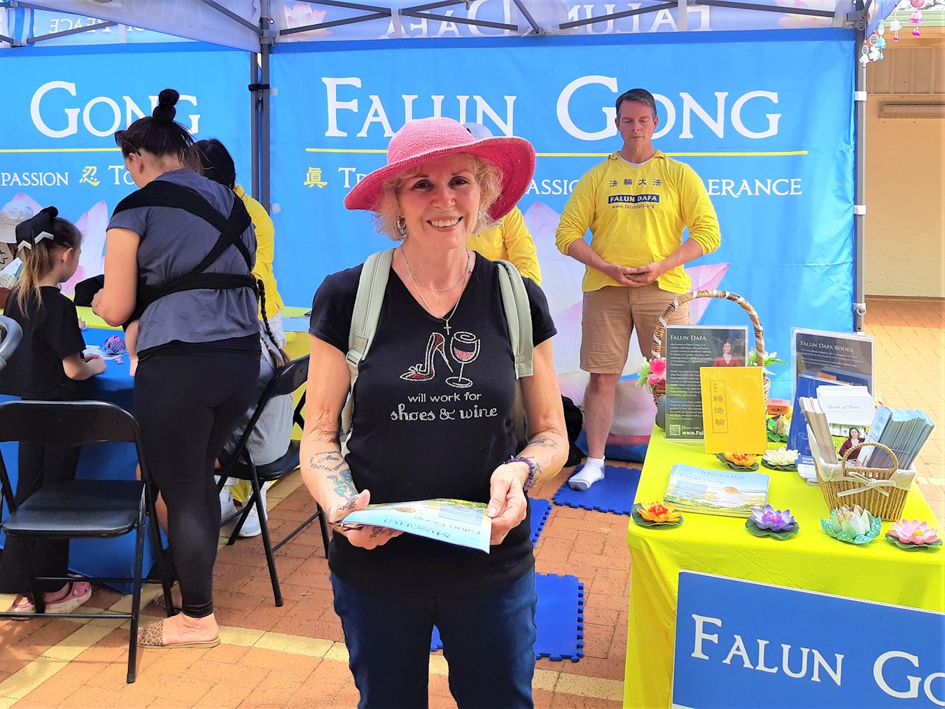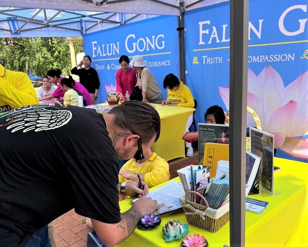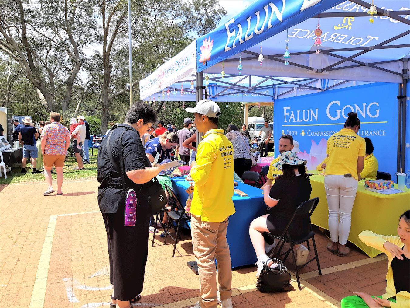 当天活动,人流熙熙攘攘。很多人接过法轮功真相资料,与学员交谈,了解真相。更有不少人对学炼功法感兴趣,询问相关信息。