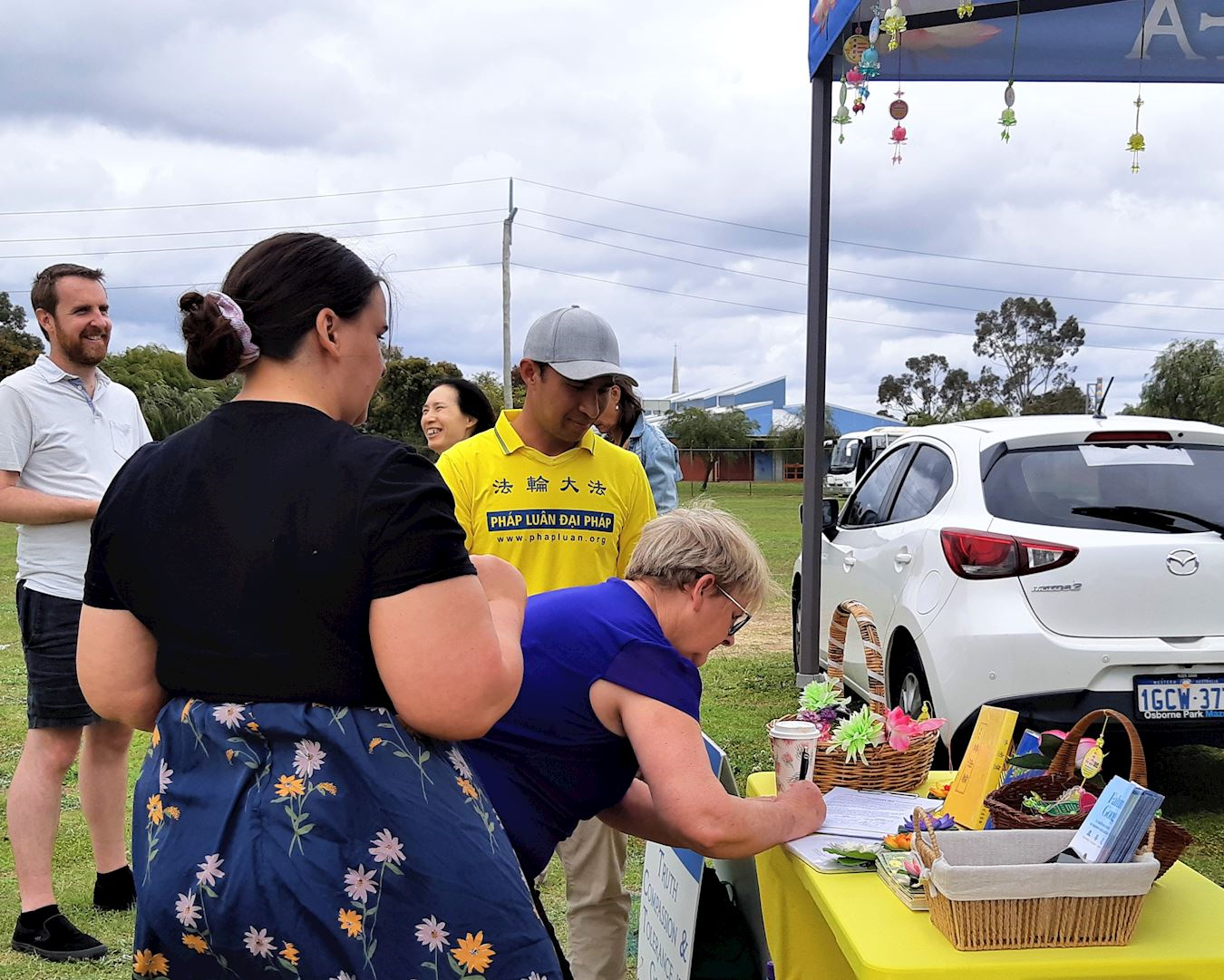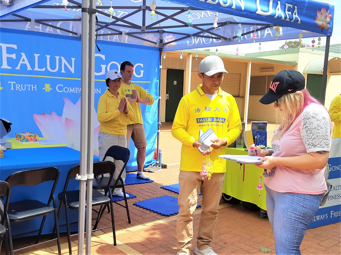 十月十九日星期六,西澳法轮功学员在位于拉什顿公园(Rushton Park)的凯尔姆斯科特农展会上设立了法轮大法展位。