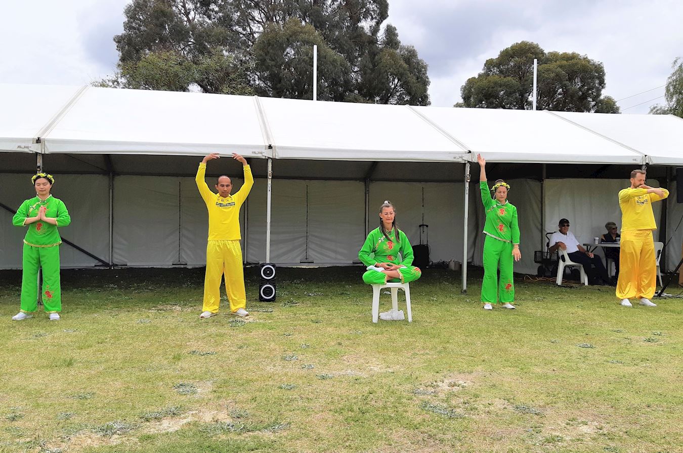 ![]() 图1:二零二四年十月十九日,西澳法轮功学员在凯尔姆斯科特农展会,向参观者演示法轮功五套功法。 |