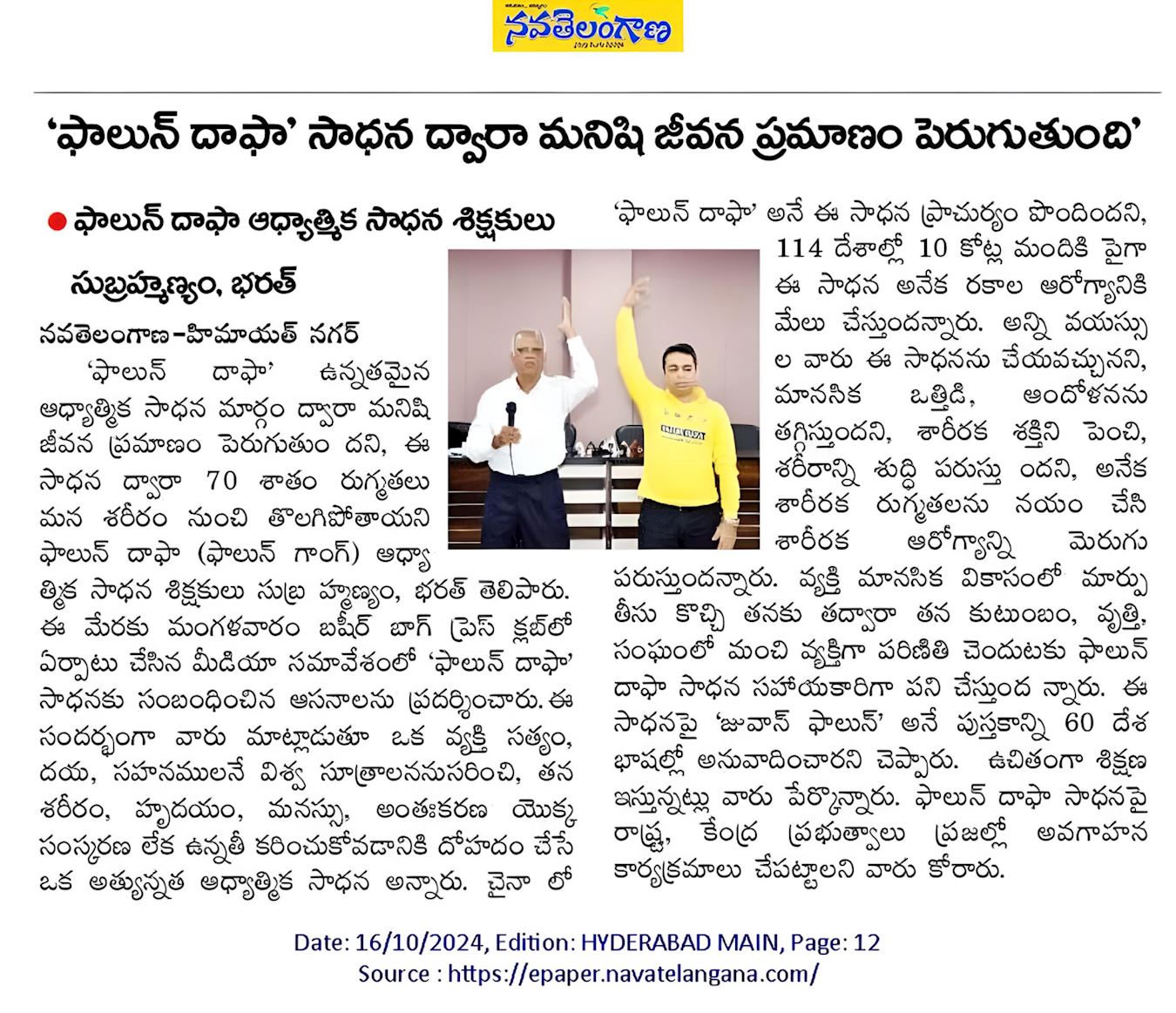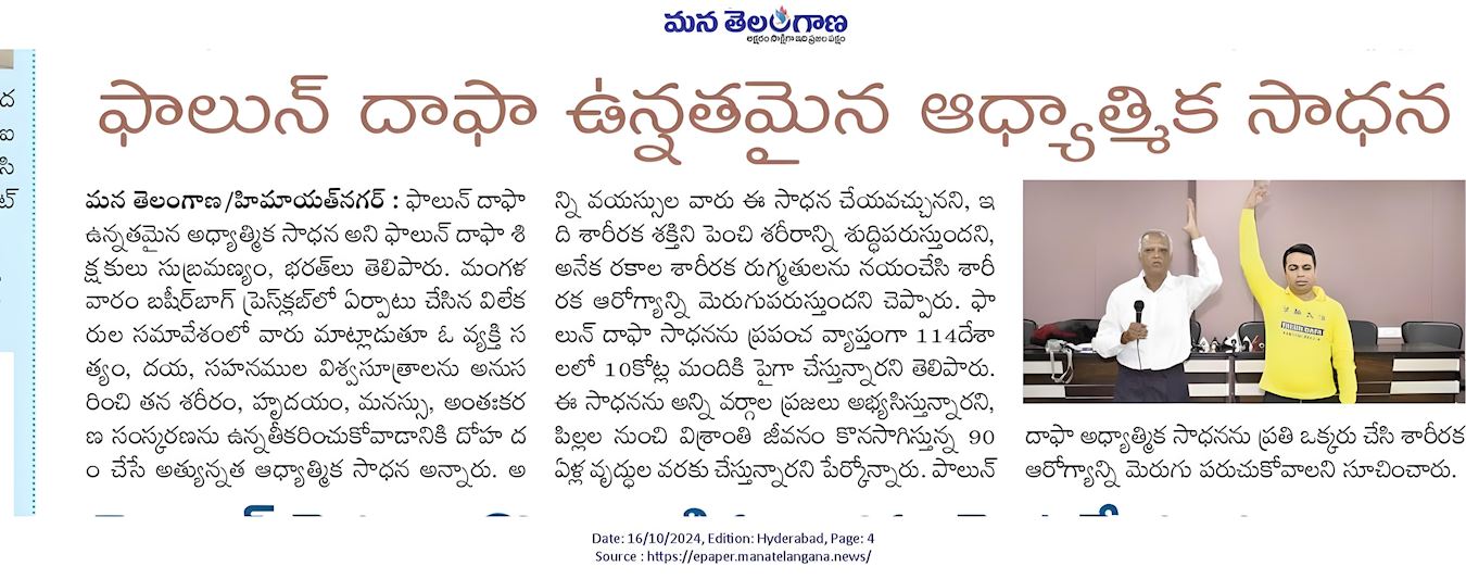 《马纳·特伦甘纳报》(Mana Telangana):法轮大法是高层次的精神修炼。