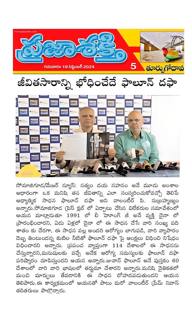 《帕拉贾·帕克沙姆报》是一份泰卢固语日报,该报表示:“通过修炼法轮大法,人们可以实现平和的人生之旅。”