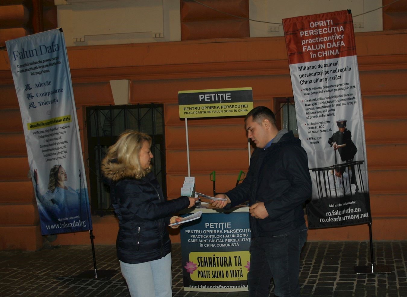 图1:二零二四年十月十九日,法轮功学员在布拉索夫的法轮功展位。