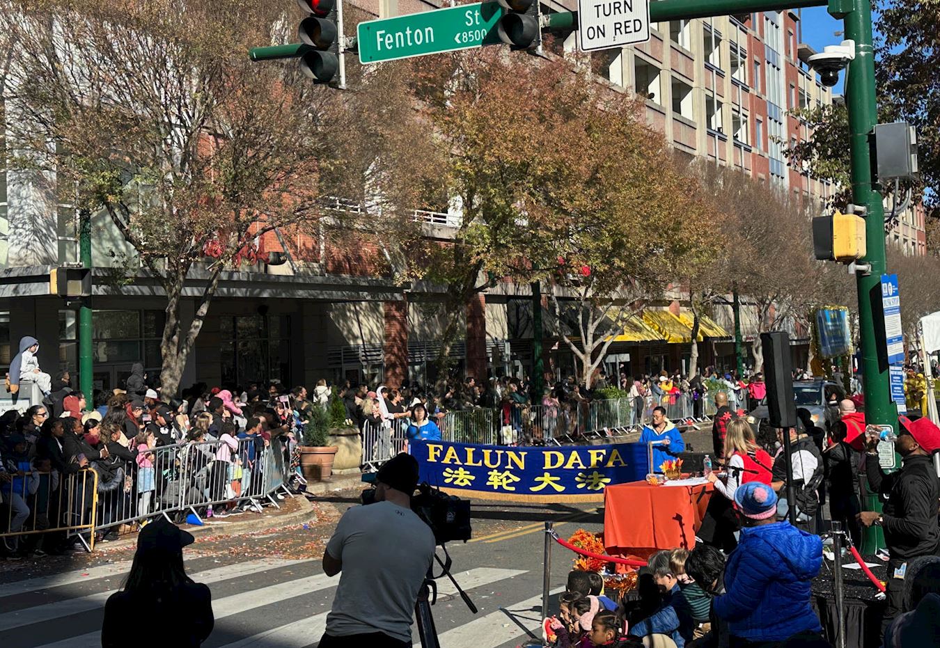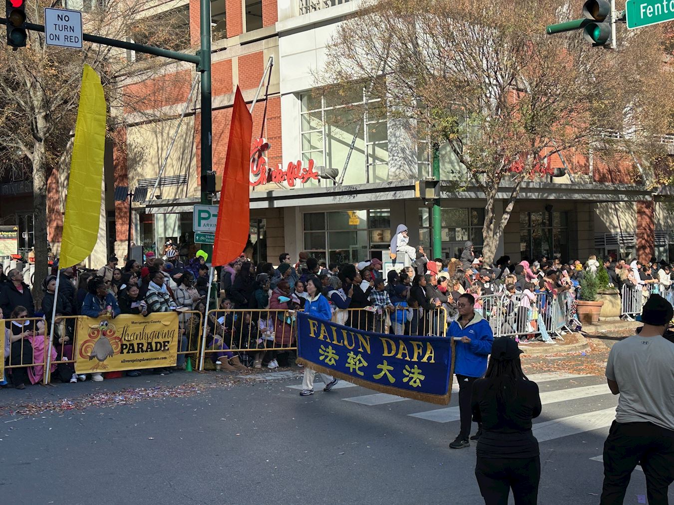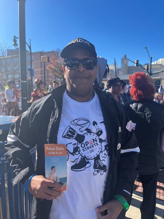 马里兰银泉居民托尼·悉南(Tony Hinnant)非常享受法轮大法游行队伍的节奏和氛围,他欣然接过大法弟子递上的传单,并表示希望明年感恩节还能看到大法弟子的游行和表演。