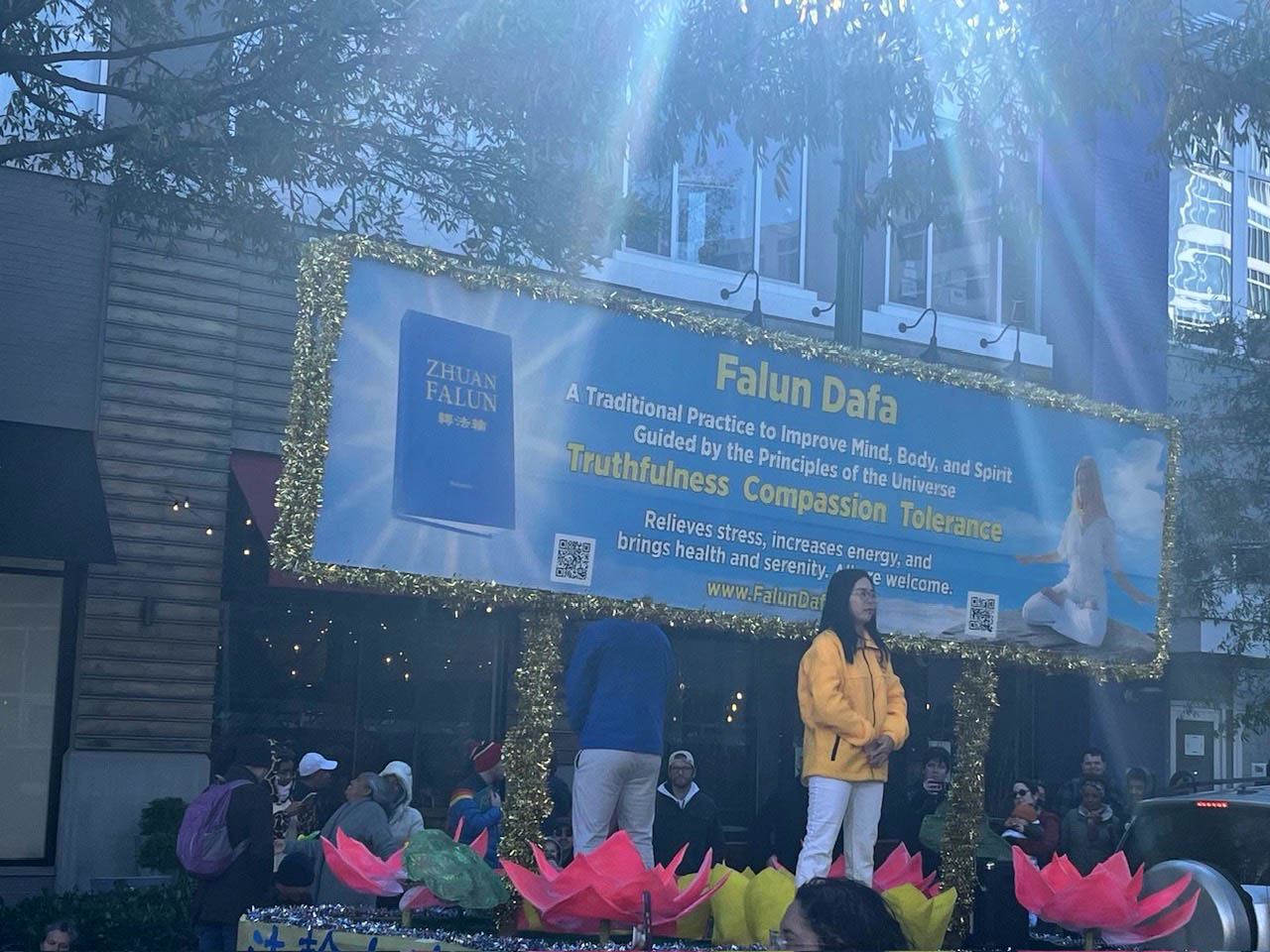 法轮功学员游行队伍包括花车和腰鼓队,两位青年法轮功学员在花车上演示功法。腰鼓队带给民众平和与喜庆,人们伴随着音乐和鼓点为他们鼓掌喝彩。写有英文的“法轮大法”、“世界需要真善忍”的横幅所传递的信息受到沿途民众的欢迎。