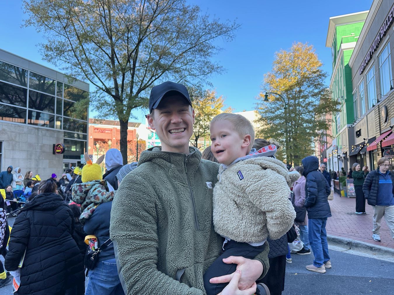 ![]() 图8:银泉市居民柯克(Kirk)抱着儿子在路边观看游行。 |