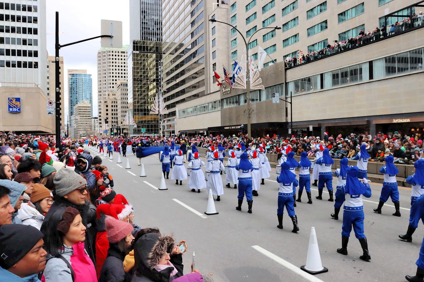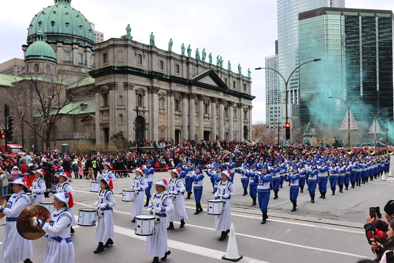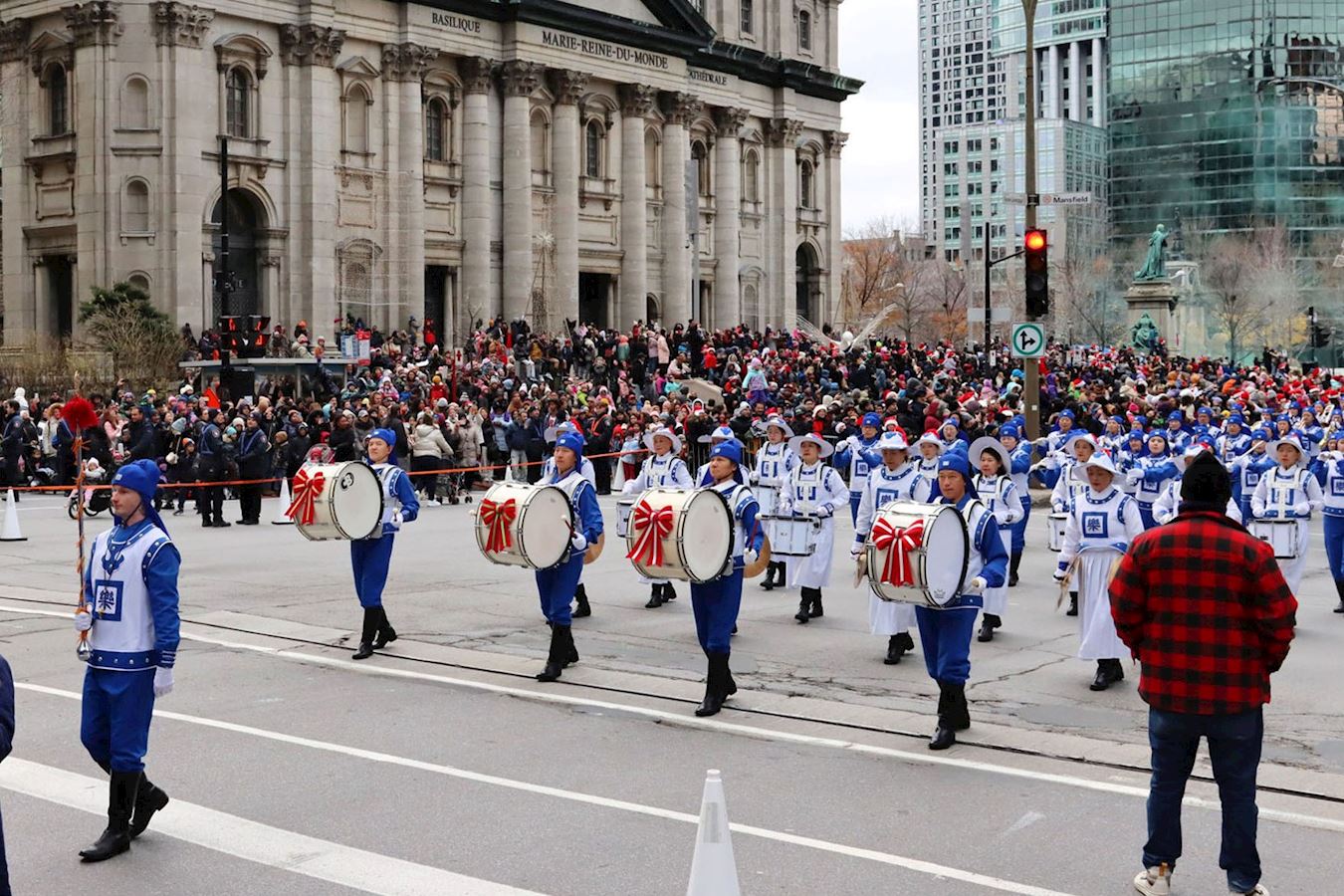 '图1~5:十一月二十三日,一年一度的圣诞大游行在蒙特利尔市中心举行,法轮大法天国乐团再度以庞大阵容出场。'