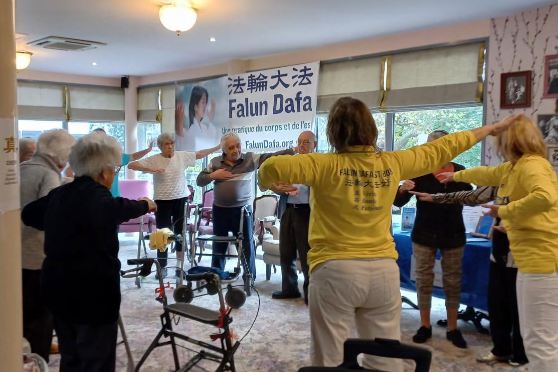 一位在福祉部门从事护理工作的人,看完法轮功学员的舞台表演后来到展位前,问能不能到他们的养老院教功和表演。