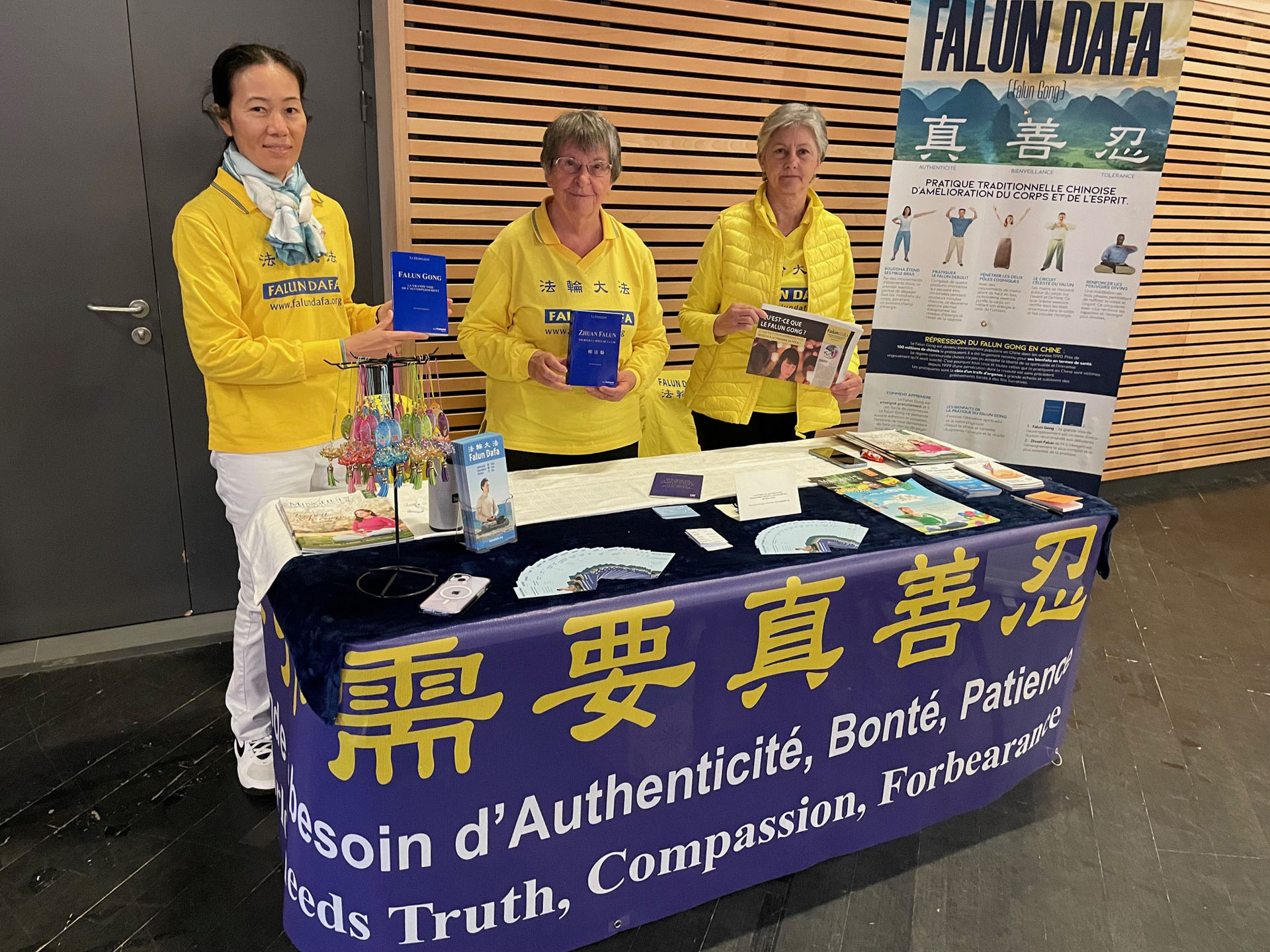 二零二四年十一月二十三日星期六,法轮功学员受邀参加了在索里尼尔举办的健康展(Salon Bulles de Bien-être),向大众介绍法轮功及其主要著作《转法轮》并演示法轮功功法。